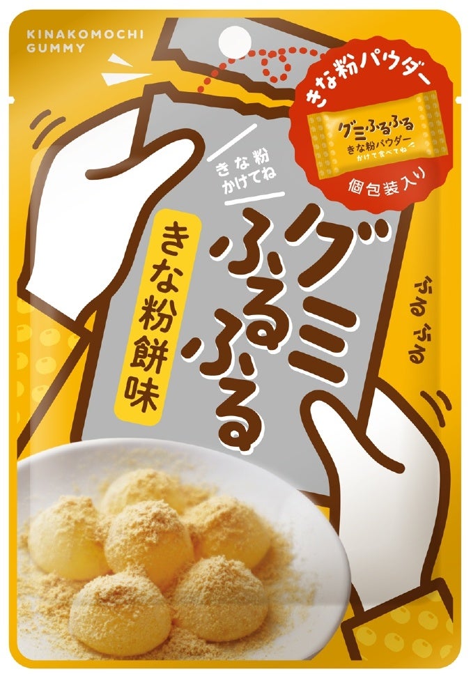 まるできな粉餅のようにもっちりとした食感のグミと、別添で振りかけるきな粉パウダーが入った「グミふるふる きな粉餅味」を発売いたします。