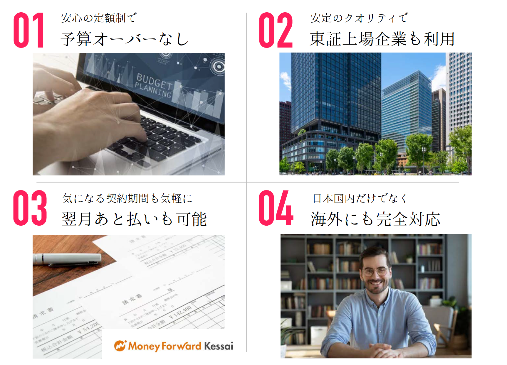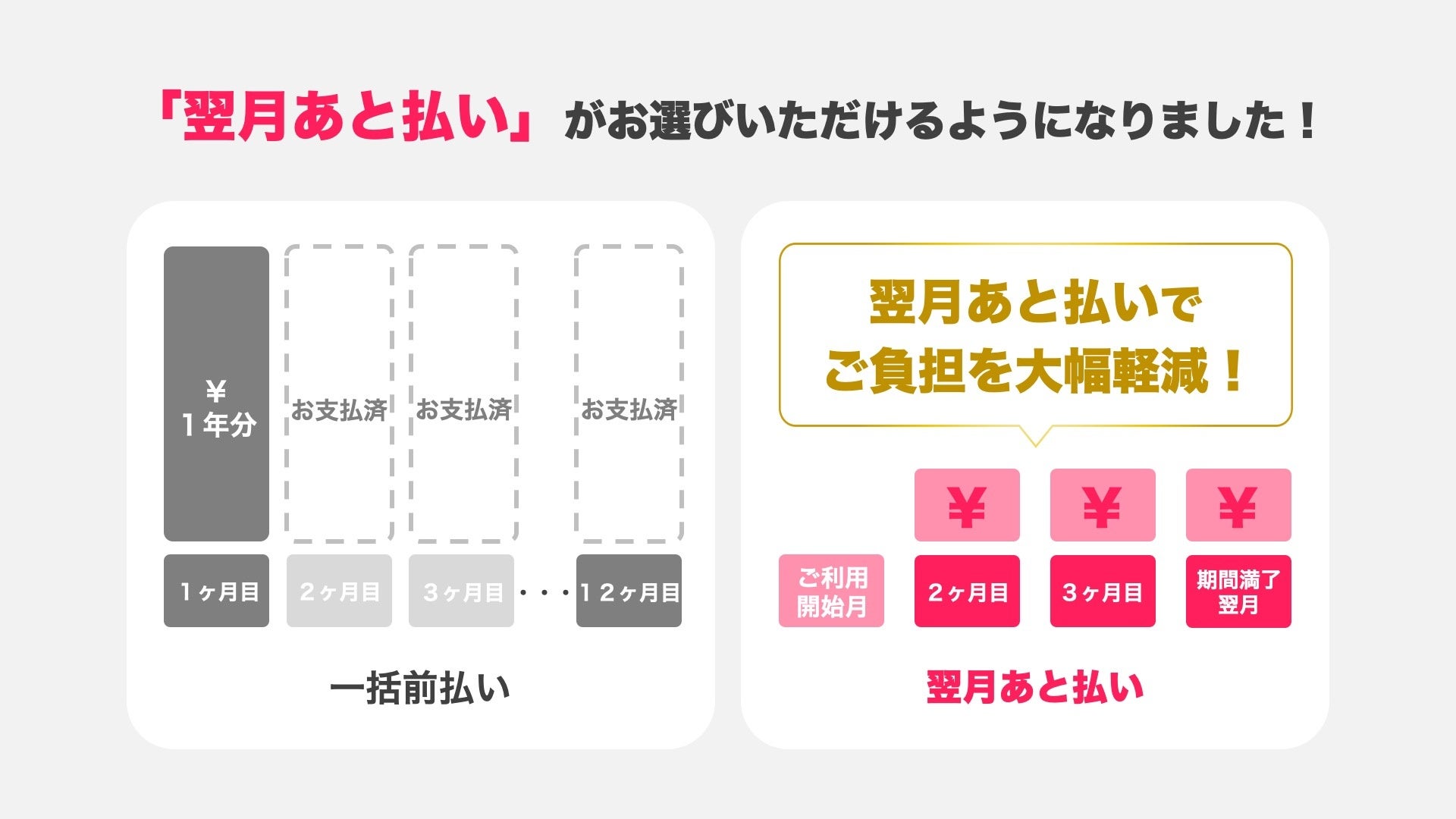 これまで一括前払いだったお支払方法に、新たに企業間後払い決済サービス『マネーフォワードケッサイ』を導入し、「翌月あと払い」もお選びいただけるようになりました。