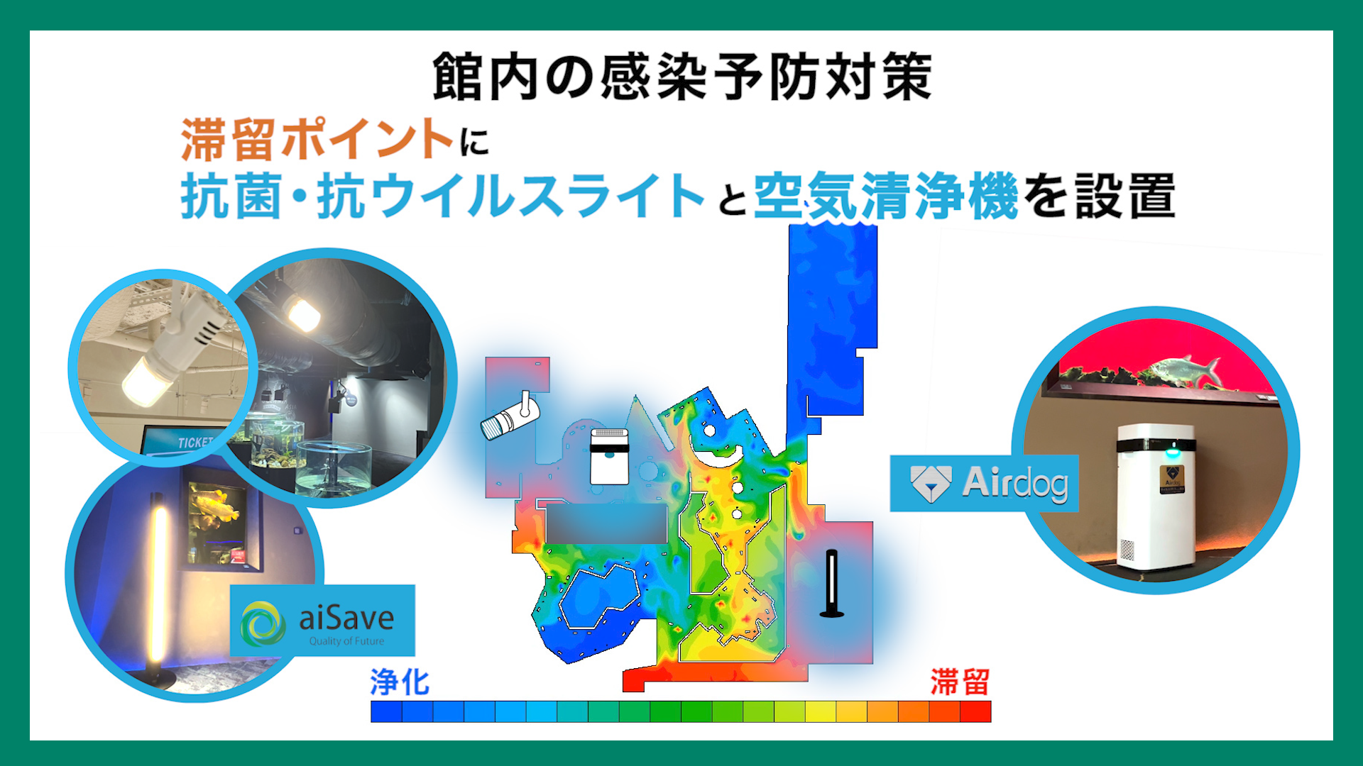 【カワスイ 川崎水族館】水族館初の「3D飛沫可視化システム」の検証と感染症拡大防止対策のため、館内に「Airdog」「アイセーブ抗菌CCFLライト」などを設置