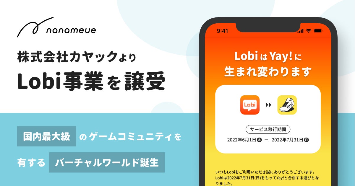 株式会社ナナメウエ(本社:東京都港区、代表取締役:石濵 嵩博、以下ナナメウエ)は、株式会社カヤック(本社:神奈川県鎌倉市、代表取締役:柳澤 大輔、以下カヤック)が運営する国内最大級のゲームコミュニティ「Lobi」を事業譲受いたしました。「Lobi」はナナメウエが運営する同世代 × 趣味趣向でつながるバーチャルワールド「Yay!」(イェイ)に統合され、国内最大級のコミュニティサービスになります。