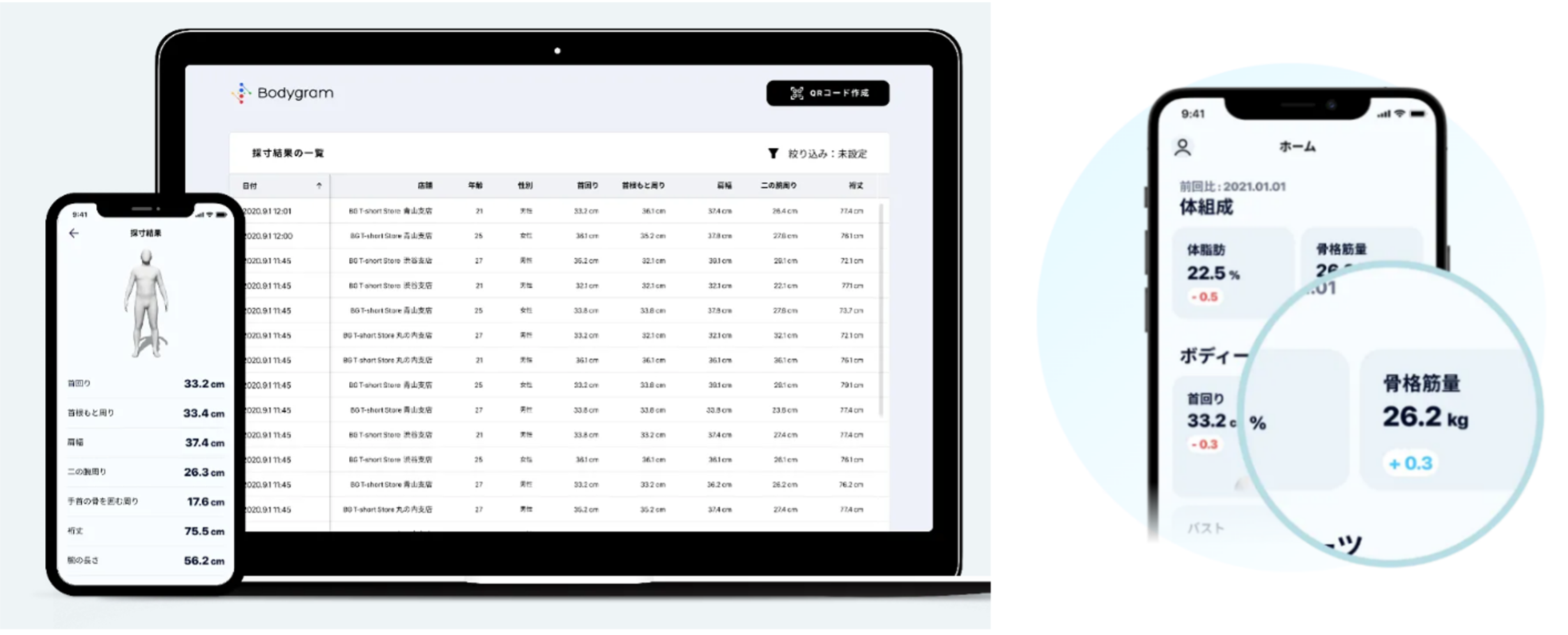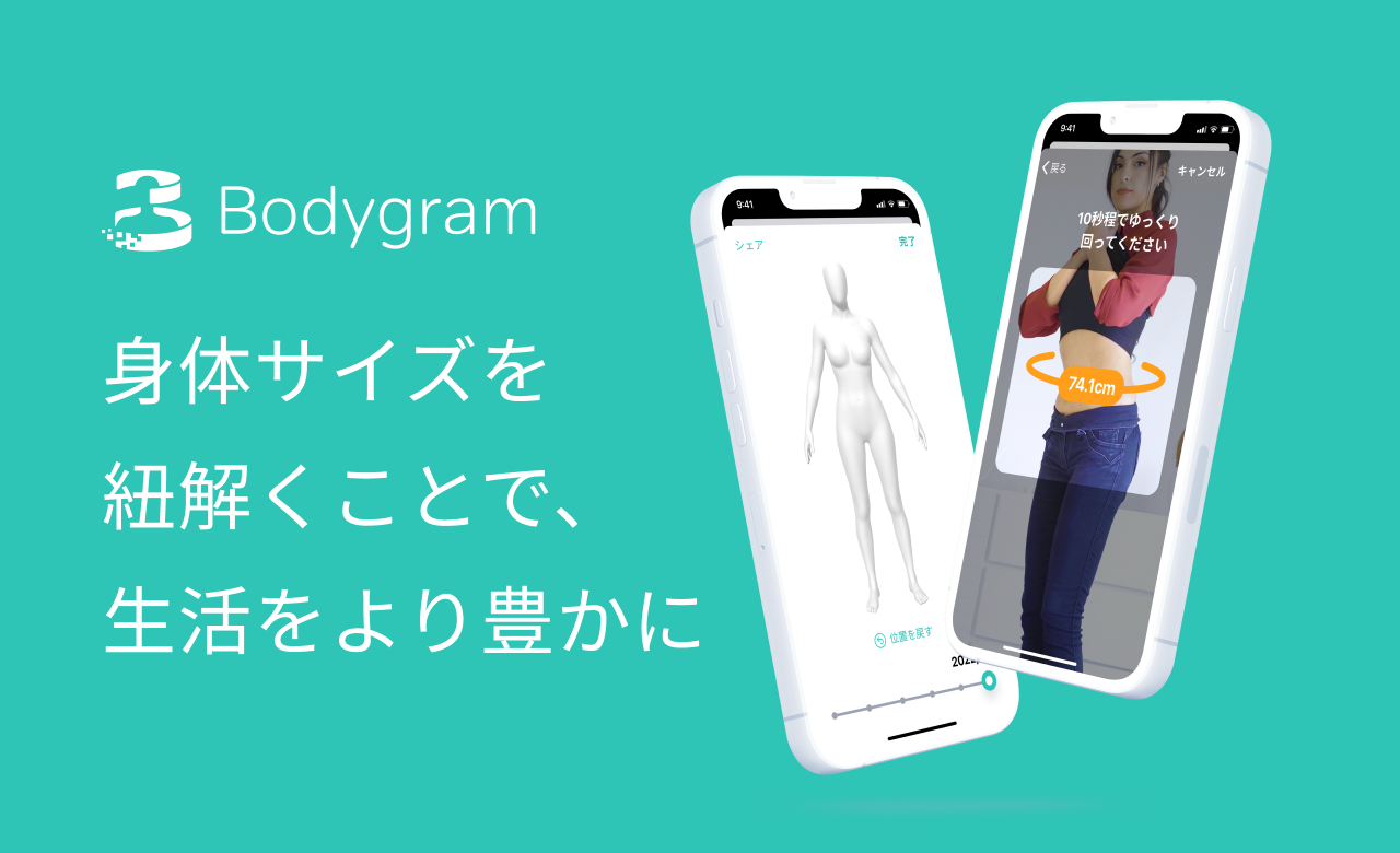 ボディグラムはAI(人工知能)の学習機能を駆使し身体サイズを推定する先進技術です。年齢・身長・体重・性別を入力し、服を着たまま、スマートフォンで正面と側面の2枚の写真を撮影するだけで被写体のボディラインを自動で検出し、腹囲・肩幅・手足の長さなど全身24ヶ所の推定計測が可能になります。これまで、BtoB事業にて制服やユニフォーム、百貨店といったアパレルをはじめ、寝具やヘルスケア領域へ技術提供・実用化を果たしており、今後もフィットネス、ウェルネスといった様々な分野での活用と展開を計画しています。また、自社アプリ「Bodygram」をApp Store及びGoogle Play で2020年6月に正式リリース。以降、スマートフォン1つで身体計測できる画期的なアプリとして20代から60代の幅広い年齢層ユーザーの関心を集め、iOSの無料アプリランキングで1位、Androidのヘルス&フィットネスのカテゴリーで1位※1を獲得しました。 ※1:iOSは2021年8月27日、Androidは2020年8月13日に獲得しました。