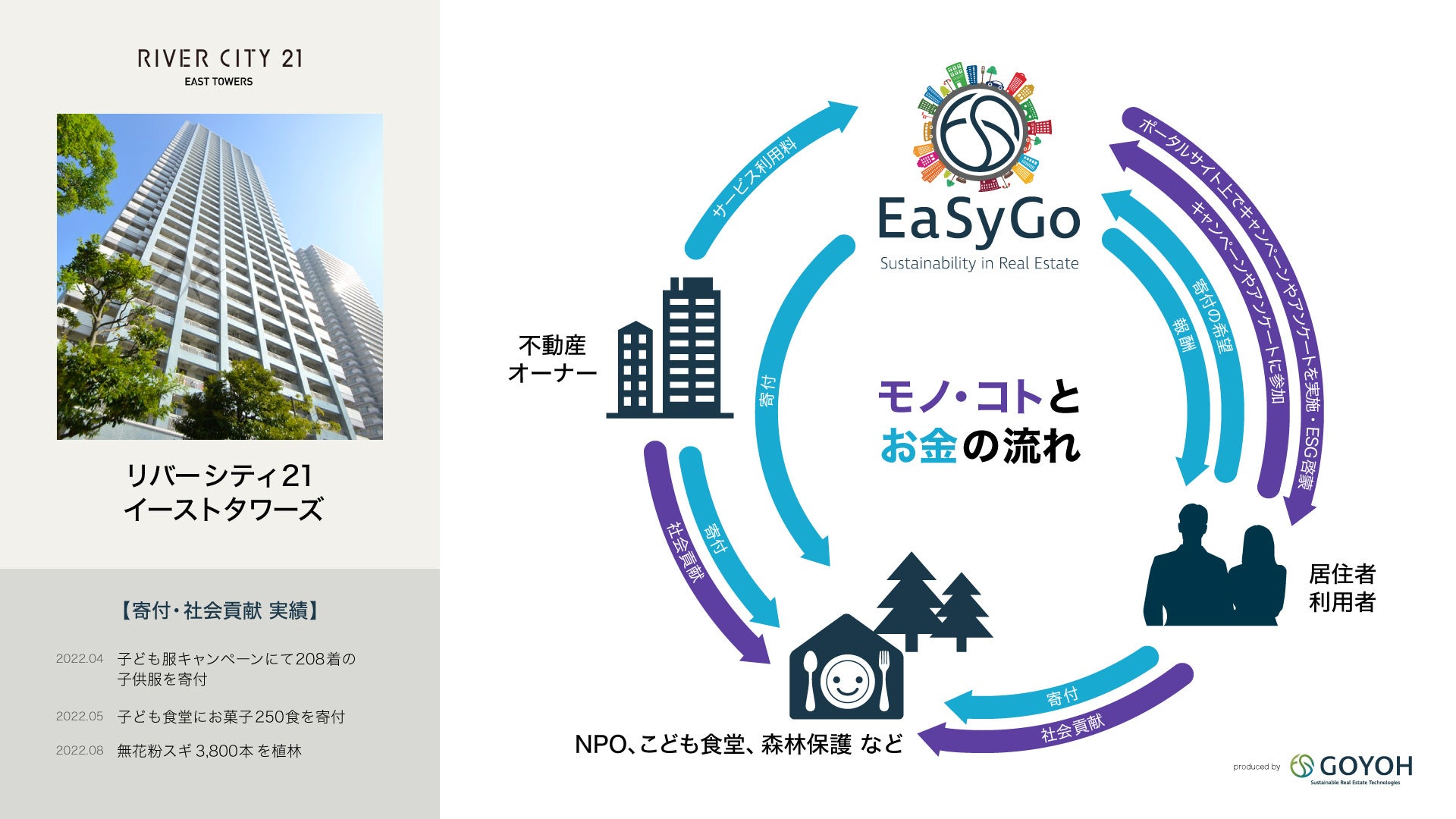 株式会社GOYOHでは、多くの海外投資家と連携し、社会貢献活動を行ってまいりました。中でも今回は、リバーシティ21(イーストタワーズⅠおよび新川)やKDX豊洲グランスクエアと連携して実施した「子ども食堂」への寄付や、「不要になった子供服」の寄付、「森林保全活動」への継続的な寄付活動など、不動産を活用した新たな寄付・社会貢献のエコシステムの社会実装について注目いただき、受賞に至りました。