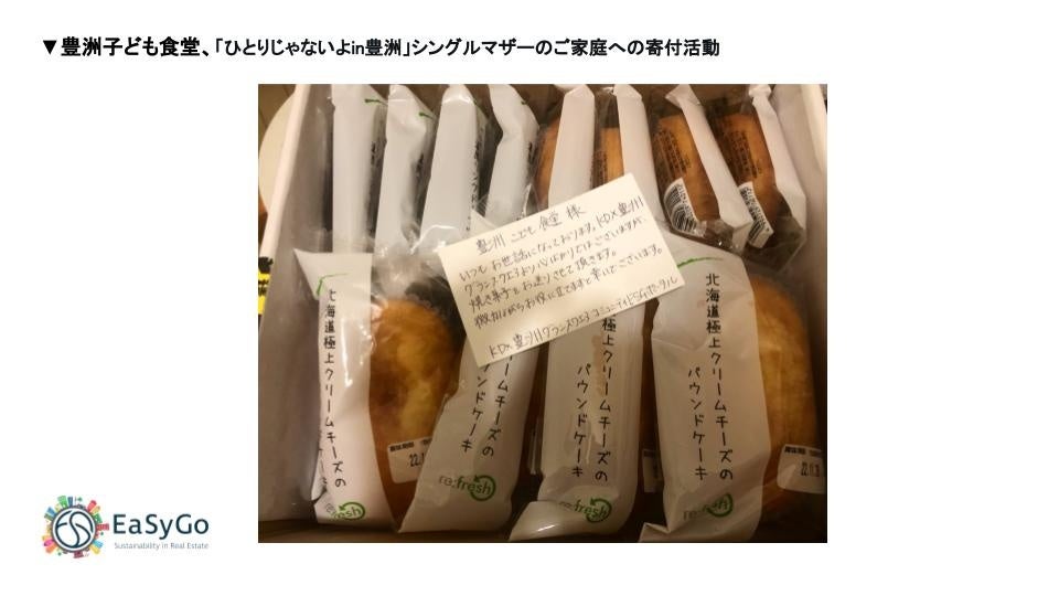 ケネディクス・プライベート投資法人およびケネディクス・オフィス投資法人が保有するオフィスビル「KDX豊洲グランスクエア」のテナント企業様・オフィス利用者と連携し、「EaSyGo」を活用して「豊洲子ども食堂」が支援する「ひとりじゃないよin豊洲」シングルマザーのご家庭への寄付活動を実施しました。社会貢献活動を通して、オフィスと地域が連携した事例となります。