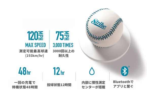STRIKEスマートボールはメジャーリーグ仕様のステッチを採用しています。 円周:9インチ~9.25インチ(22.9cm~23.5cm) 重量:5oz~5.25oz(141.8g~148.8g) 円周:9インチ~9.25インチ(22.9cm~23.5cm) 素材:天然牛皮 芯:ゴム、コルク 縫合糸:ポリエステル混紡糸、純綿 ■ワイヤレス充電器規格 サイズ:直径8.5cm 高さ:2.5cm INPUT:DC 5V/1A 製品の使用上の注意 STRIKEスマートボールが測定できる回転速度は4000rpm以下です iOS9以上 Android5.0以上 Bluetooth4.0以上