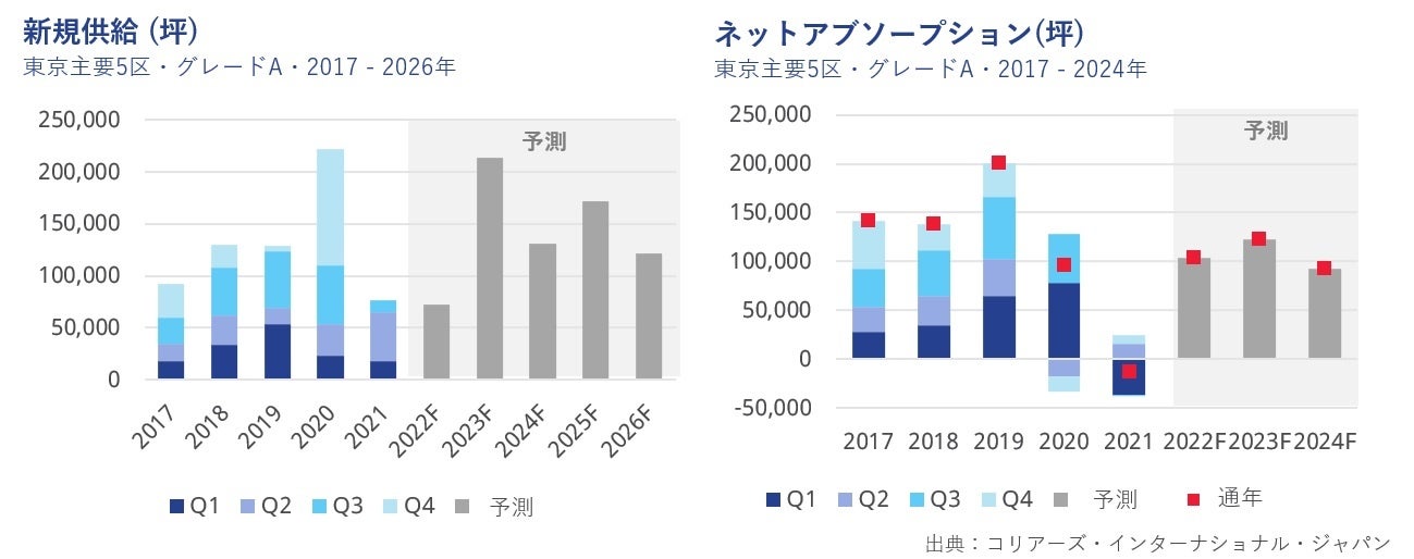 今後1年間にわたって、大規模な再開発プロジェクトの竣工など大型物件の供給は、過去数年間と比較すると少なく、一方で、コロナ禍の2020年後半以降、動きの停滞していた賃貸オフィス市場の需要は、回復傾向を見せ始めています。2022年は、例年より少ない新規供給と需要の回復傾向をうけて、需給バランスの改善が進むとみられています。