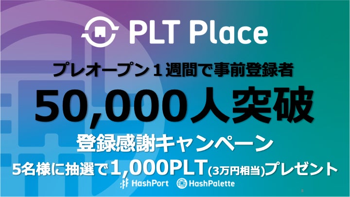 株式会社HashPalette(本社:東京都港区、代表取締役CEO:吉田世博、以下HashPalette)が運営するNFTマーケットプレイス「PLT Place」において、3/17のプレオープンから1週間で事前登録者数が50,000人を突破したことをお知らせします。