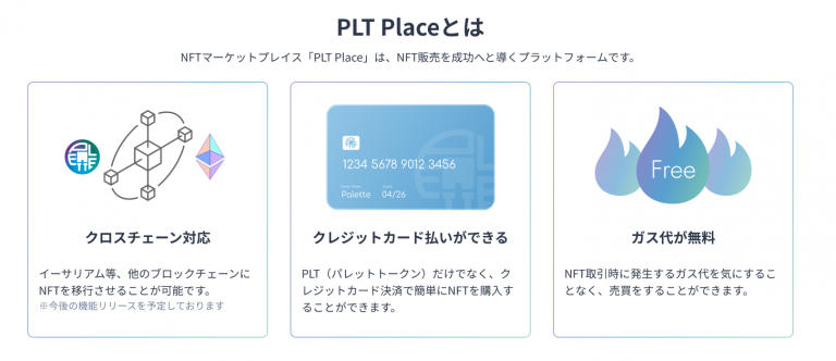 PLT Placeでは、2021年7月にHashPaletteが国内で初めてIEOを実施した「PLT(パレットトークン)」を決済で利用することができる他、クレジットカードでの決済にも対応しております。また、PLT PlaceはHashPaletteが手がけるNFTに特化したブロックチェーン「Palette(パレット)」を採用しており、ユーザーはガス手数料無料で売買を行うことが可能です。今後はクロスチェーン機能をアップデートし、ユーザー自身が簡単に他のブロックチェーンにNFTを移行できることも予定しております。