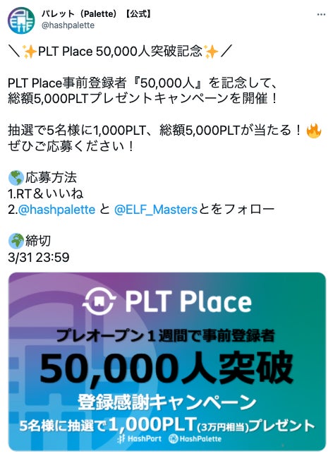 ■「PLT Place 事前登録者50,000人突破記念!5,000PLTプレゼントキャンペーン」について