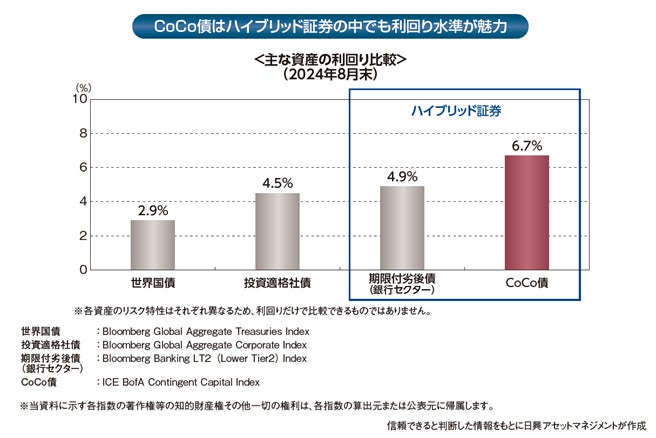 「グローバルCoCo債ファンド」は、世界の金融機関が発行するハイブリッド証券(株式と債券の特徴を併せ持つ証券)の中でも、利回り水準の高さなどに着目し、CoCo債(Contingent Convertible Bond:偶発転換社債)を中心に投資します。CoCo債とは、発行体である金融機関の損失計上により資本が減少することなどにより、自己資本比率があらかじめ定められた水準を下回った場合などにおいて、元本の一部または全部が削減される、または、強制的に株式に転換されるなどの仕組み(トリガー条項)を有する証券を言います。トリガー条項があるため、他の債券よりもリスクが高い分、利回りも高くなっています。