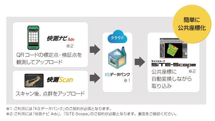 クラウドサービス「KSデータバンク」を介して、ICT施工現場端末アプリ「快測ナビAdv」と点群処理ソフトウェア「SiTE-Scope」と連携。