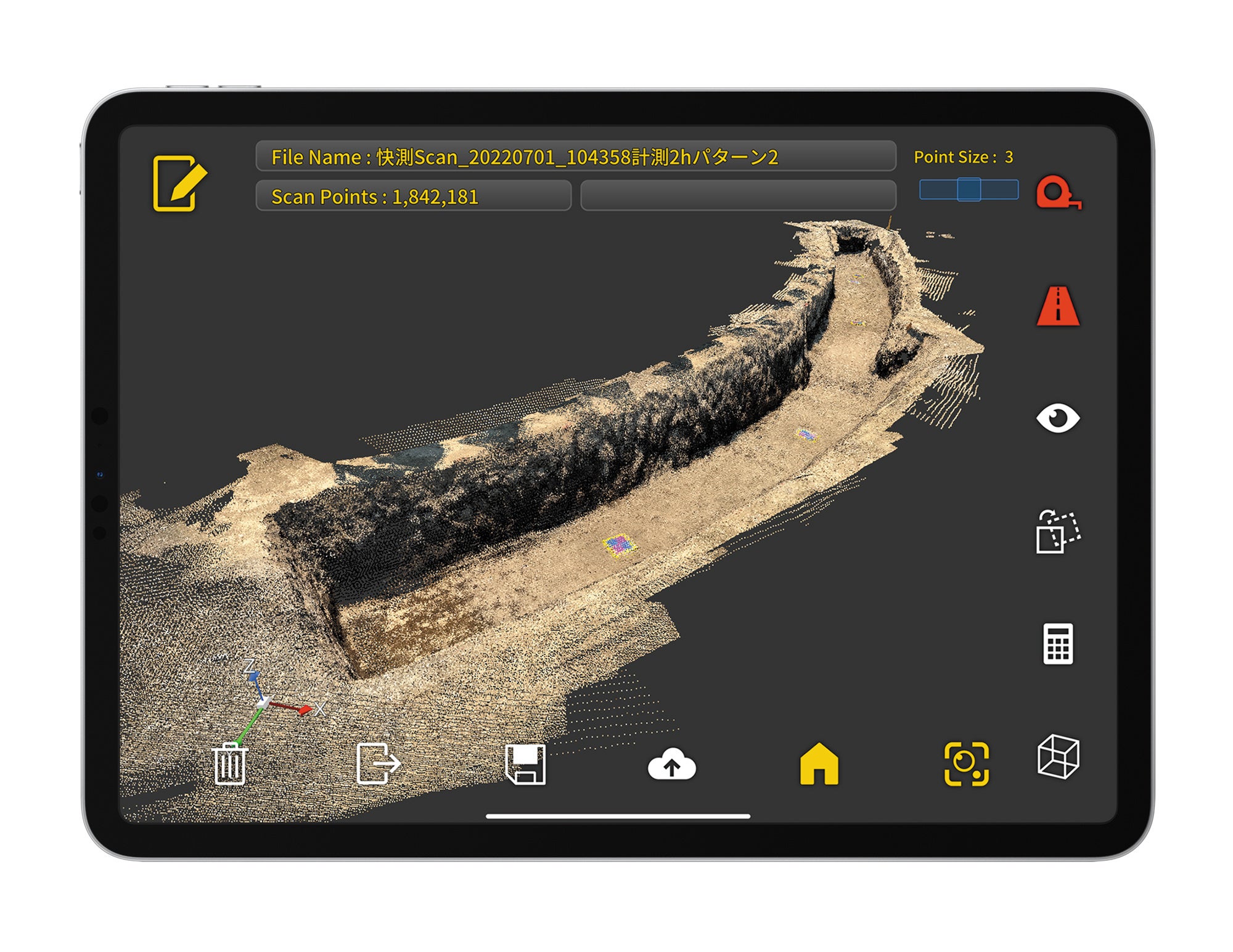 「快測Scan」は、点群を取得したい対象物をスキャンすれば、実物画像に重ねてスキャン結果の点群を表示することができます。 また、国土交通省 『3次元計測技術を用いた出来形管理要領(案)』に準拠しているので、公共工事の小規模土工などで出来形計測が手軽に行うことができます。