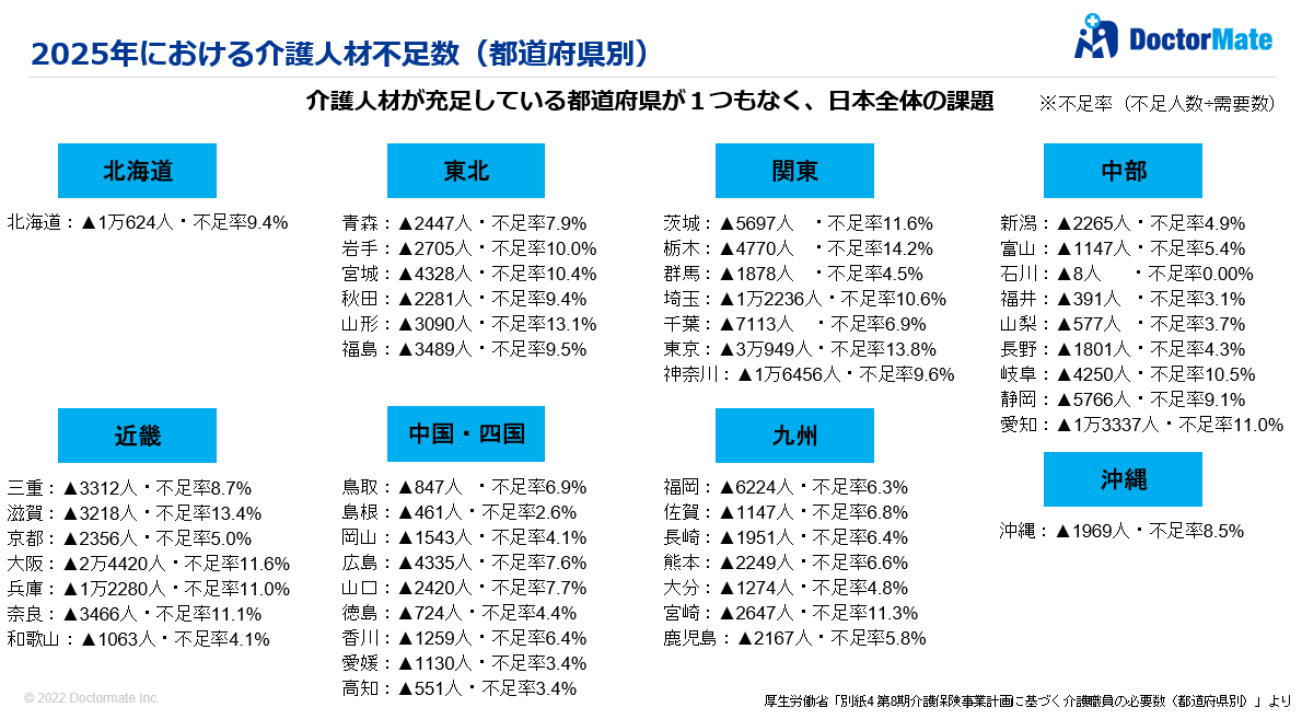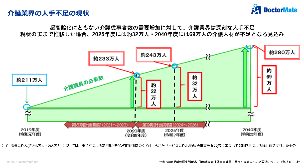 戦後すぐの第一次ベビーブーム(1947年~1949年)の時に生まれた、いわゆる「団塊の世代」800万人全員が75歳以上、つまり後期高齢者になる2025年には、約32万人の介護人材が不足することが予測されていますが、2022年の現時点で、すでに介護現場は慢性的な人材不足の状況にあります。