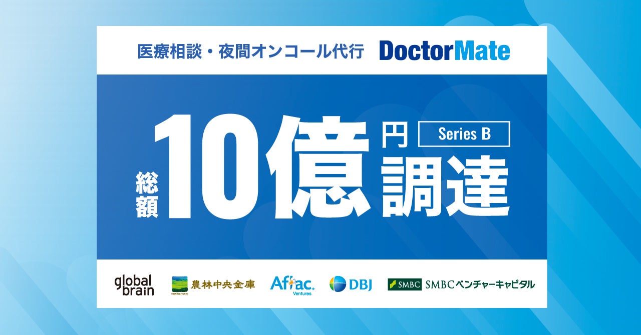 介護施設向けに医療相談・夜間オンコール代行を提供するドクターメイト株式会社(本社:東京都中央区、代表取締役:青柳 直樹)は、シリーズBラウンドにおいて、グローバル・ブレイン及び同社が運営する農林中金イノベーションファンド 、Aflac Ventures LLC(Aflac Ventures Japan株式会社が投資活動を支援)、DBJキャピタル並びにSMBCベンチャーキャピタルの5社を第三者割当増資の引受先として合計10億円を調達したことをお知らせいたします。