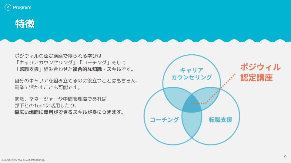 ポジウィルの認定講座で得られる学びは「キャリアカウンセリング」「コーチング」そして「転職支援」を組み合わせた複合的な知識・スキルです。