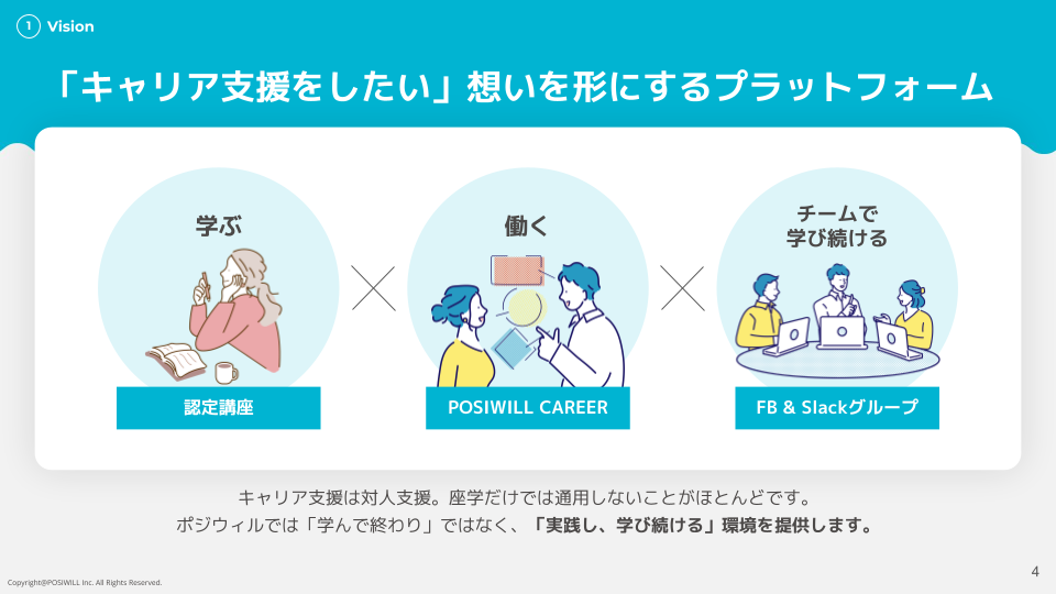 今回発表した「ポジウィル認定講座」は、「個を変え、社会を動かす、生き方支援カンパニーへ。」というビジョンの実現に向けた一歩として、弊社が培ってきた「個を変える」ノウハウを社会に共有させていただく取り組みです。同じ志を持つ皆様が輝けるプラットフォームとして成長させ、これからも「生き方支援」を強化して参ります。