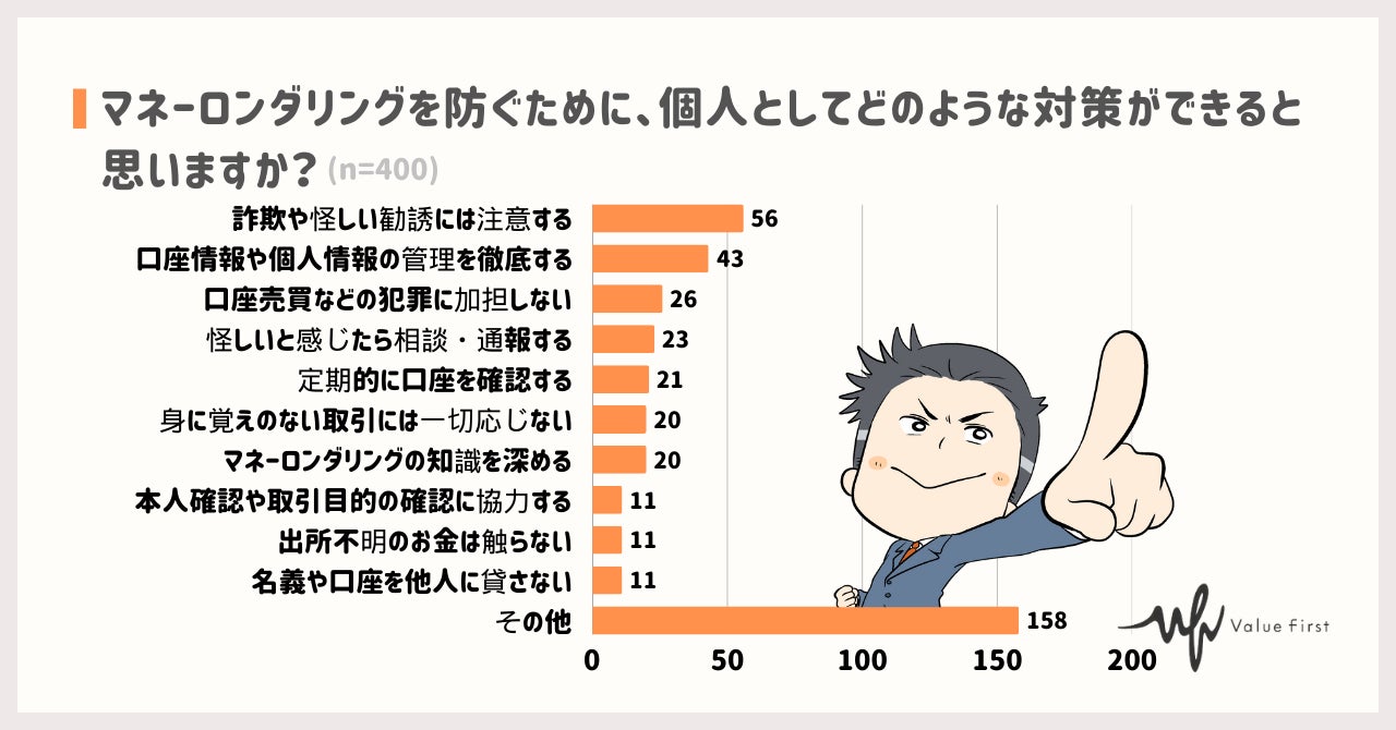 他にも「口座情報や個人情報の管理を徹底する」や「口座売買などの犯罪に加担しない」、「怪しいと感じたら相談・通報する」といった回答も。