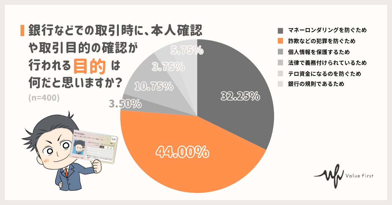 「銀行などでの取引時に、本人確認や取引目的の確認が行われる目的は何だと思いますか?」という質問に対し、最も多かった回答は「詐欺などの犯罪を防ぐため」でした。