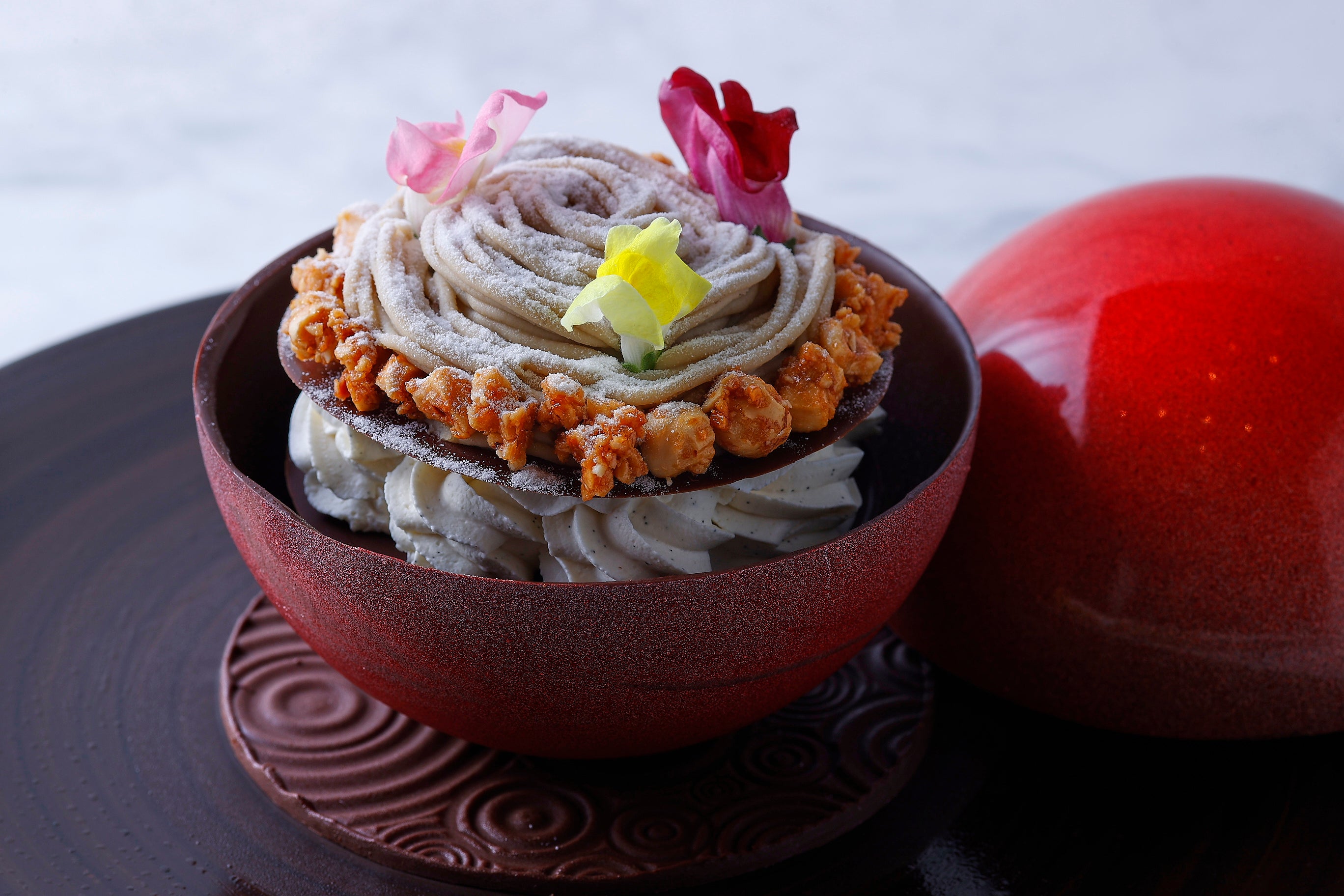 球体を開けると中からモンブランが登場するサプライズに歓声が上がります。和栗の中でも上品な香りの丹波栗を使用したオリジナルマロンクリームは、ほとんど甘みを使用せず栗の風味を生かしていますヨーロッパ産の栗を用いたオリジナルマロンクリームは軽くラム酒が香る滑らかさ。アーモンド風味のメレンゲ、マスカルポーネシャンティ、ショコラとともに、見目麗しく特別な装いのモンブランへ昇華させました。見た目も味もホテルメイドならではのぜいたくさ。大切な人への贈り物として、また自分へのご褒美として特別なモンブランはいかがですか?