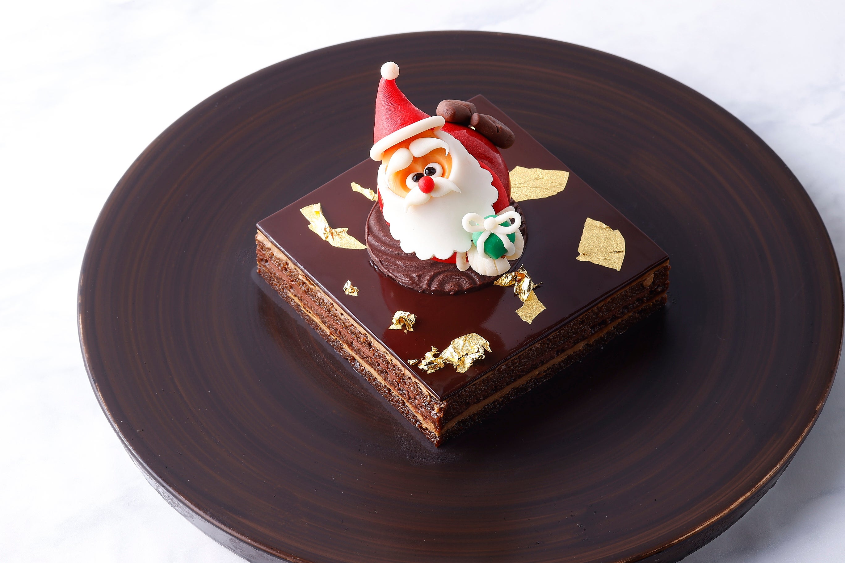 シェフパティシエ 髙田 一哉がフランスのロレーヌ地方で働いていたお店で出会った伝統的なオペラのレシピを大切に培い、作り上げたシグネチャ―ケーキ。メインダイニングイタリア料理 RISTORANTE OZIOのデザートとしてもご提供していますが、お客様から多数の要望を受け、このたびクリスマスケーキとして初登場いたしました。オペラの香りの要となるコーヒーは、ホテルで提供しているエスプレッソをじっくりと蒸らして香り高いコーヒーエキスを抽出。このコーヒーエキスをしみこませた生地は、一口ごとにコーヒーの上品な香りが広がります。またバタークリームはアングレーズを加えコクをプラス。チョコレートのガナッシュは、ヴァローナのクーベルチュール(カカオ約70%)を使用した滑らかなくちどけです。表面にあしらった金箔が映し出すそのゴージャスな雰囲気と、何層にも重なるケーキの断面は、豪華絢爛なパリのオペラ座の観客席を表しており、クリスマスのひとときを華やかに、そしてキュートなサンタが笑顔を演出します。