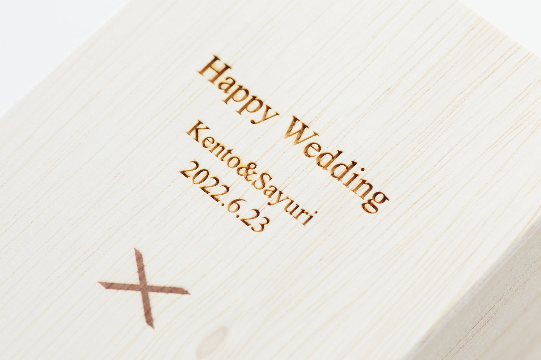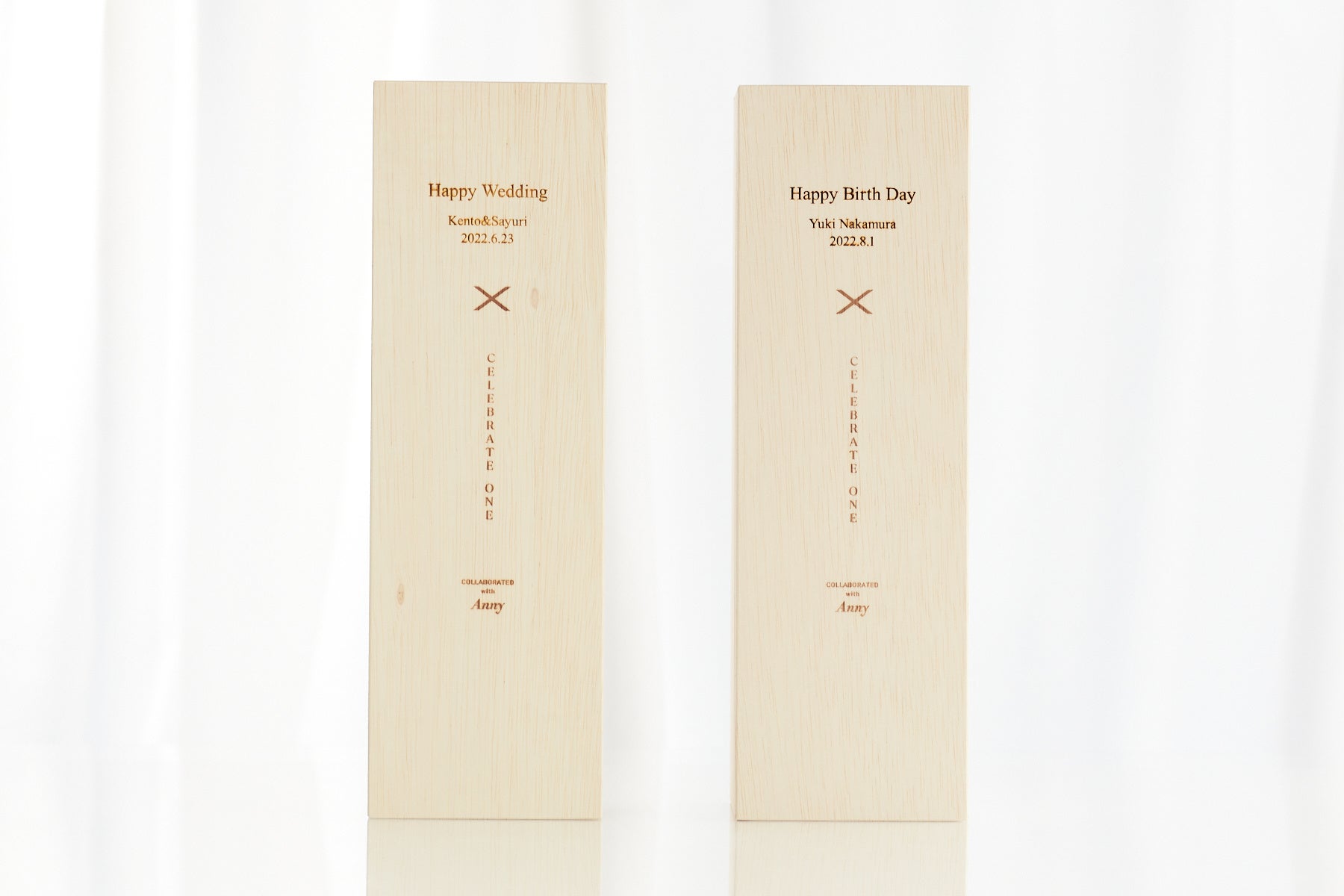 完全オリジナル制作の木箱は、名入れ可能です。名入れ有りの場合は【メッセージ、名前、日付】の3つを自由に彫刻することができます。世界に1つだけのギフトを贈ることができ、1点からご注文ができます。