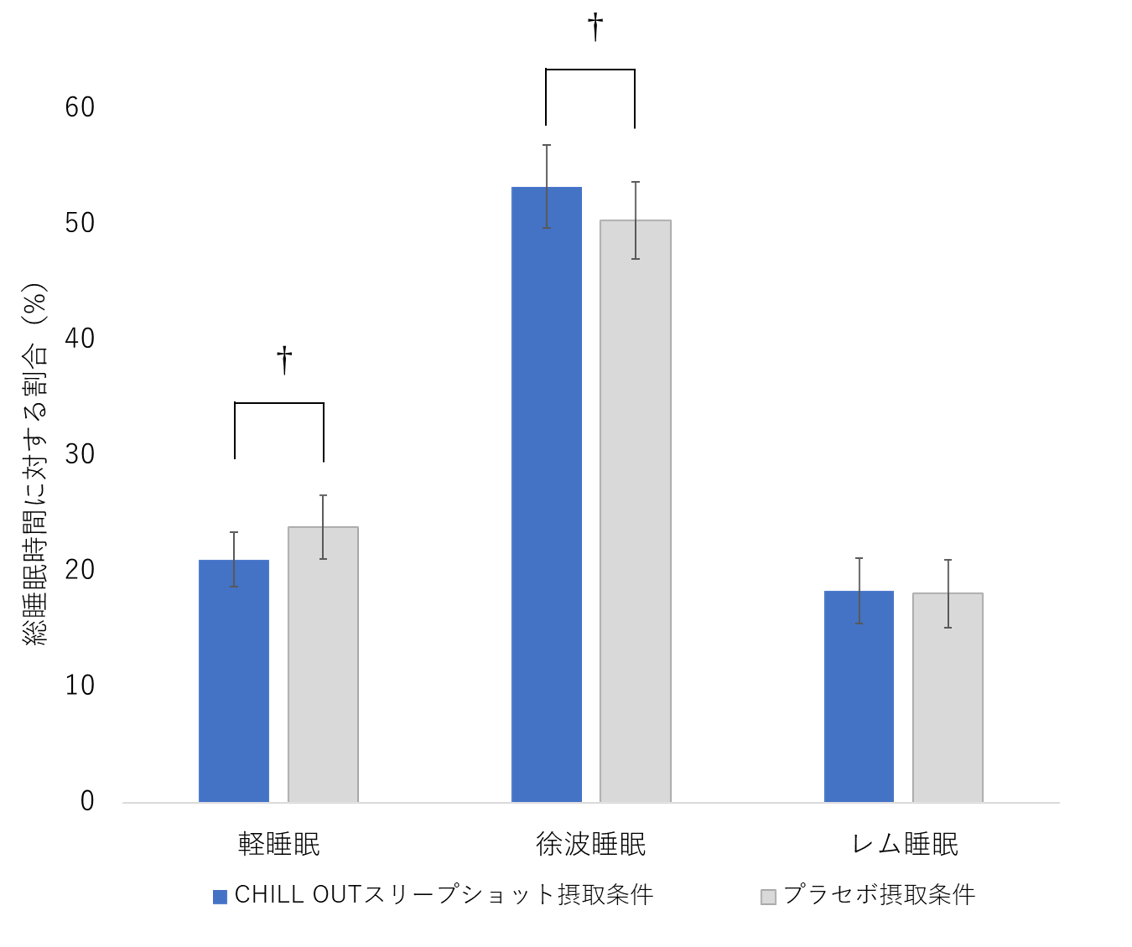 まず睡眠時間における軽睡眠期の割合、徐波睡眠期の割合、レム睡眠期の割合がCHILL OUTスリープショット摂取条件とプラセボ摂取条件で変化が観察されるかの解析を行った。(睡眠は、脳が覚醒時と同様にはたらき、夢を見せ情報の整理に関与すると考えられている「レム睡眠」と、身体の回復に寄与する深い睡眠である「ノンレム睡眠」に分けられることが知られている。「軽睡眠」、「徐波睡眠」は、ノンレム睡眠を睡眠段階に応じて分割した区分である。軽睡眠は比較的浅い睡眠であるのに対し、徐波睡眠は一般的に熟睡と言われる状態であることが知られている。)
