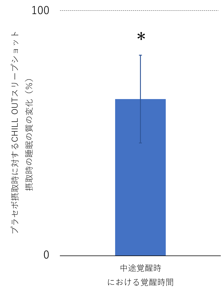 同じく、各個人のデータごとに、CHILL OUTスリープショット摂取により1時間あたりの総覚醒回数(1エポック)あたりの覚醒時間がどのように変動したのかを算出し、プラセボ摂取時に対するCHILL OUTスリープショット摂取時の中途覚醒時における覚醒時間の変化率(%)を計算した(図3)。中途覚醒は不眠症状とも関連しており、その回数や時間は健康的な睡眠に関与する指標である。解析の結果、中途覚醒時における覚醒時間がプラセボ飲用時と比較して有意に減少することが確認された。