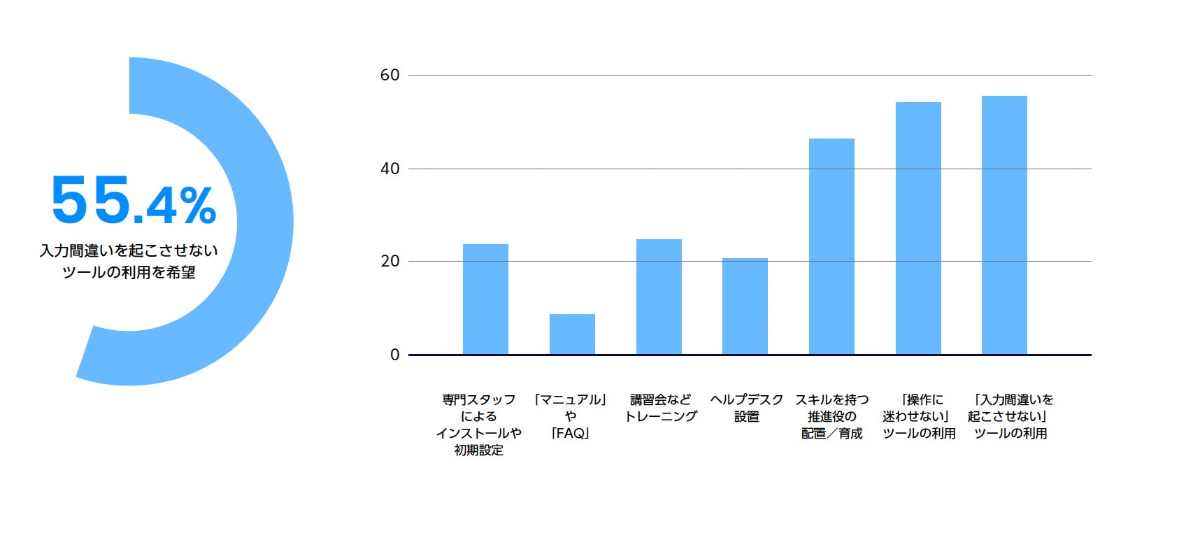 今後開始してほしいサポートとして挙げられたのは、「入力や選択など定型操作を自動実行するなど『入力間違いを起こさせない』ツールの利用」が55.4%と最も多く、次に「用語説明や入力ルールを操作画面上に表示するなど『操作に迷わせない』ツールの利用」(54.2%)でした(図4)。
