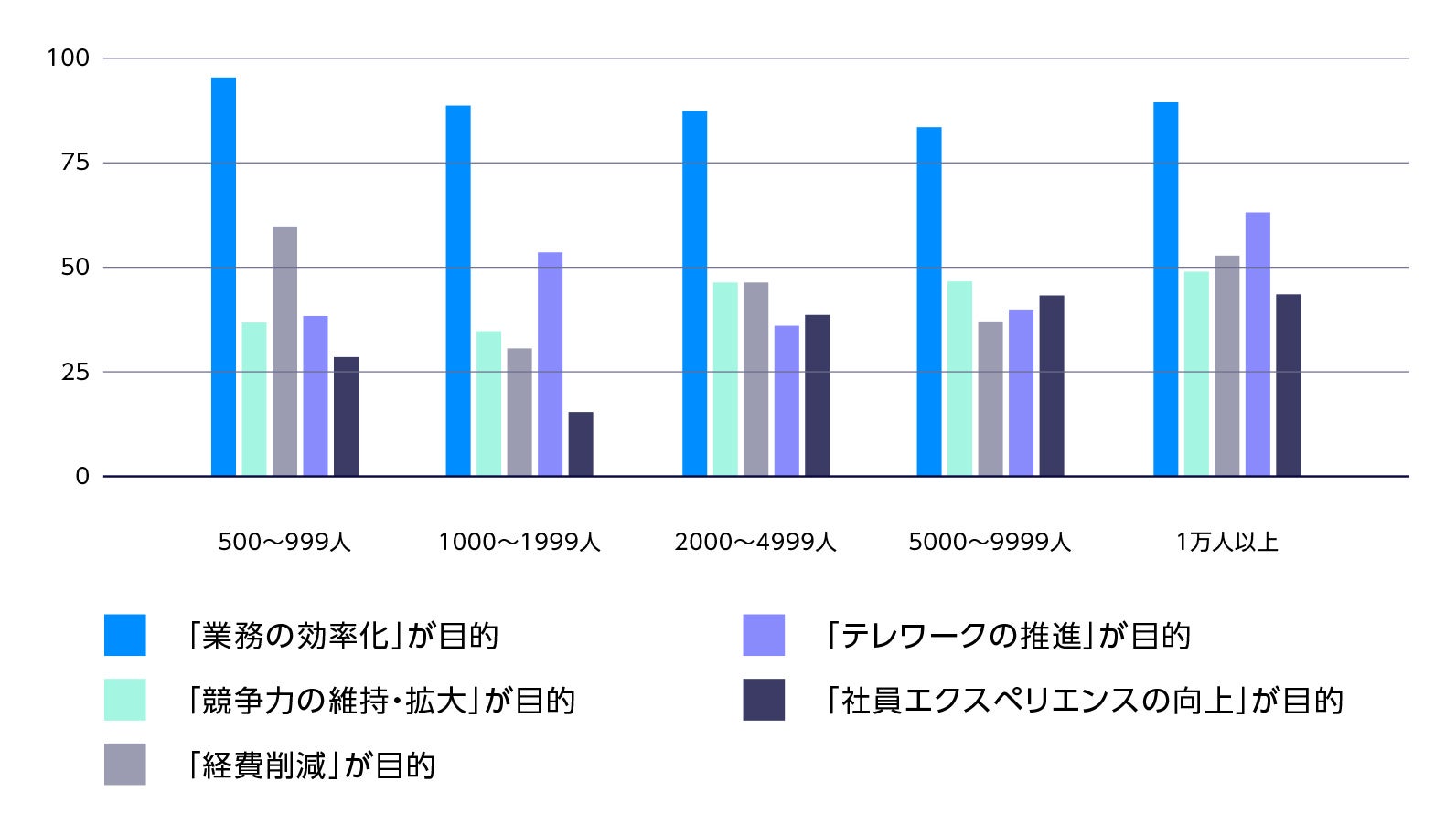 「デジタルツール活用」の目的には、90%の回答者が「業務の効率化」と回答。また、従業員2000人以上の企業では、「社員エクスペリエンス(EX)の向上・優秀な人材の確保」を目的に挙げる人の比率が、従業員2000人未満の企業と比較すると顕著に高く、最大で28ポイントの開きがあります(図1)。