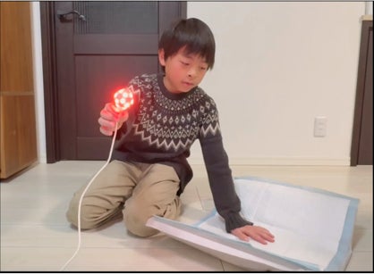 犬が夜にウンチをしてしまった時、気づかせてくれるセンサー&ライト。お母さんが夜に犬のウンチを掃除する際に暗くて煩わしいという課題から企画。micro:bitというロボットとILLUMMEのプログラミングを組み合わせて制作。犬がオリジナルのシートに乗り、10秒間居続けたらライトが光る仕組みです。