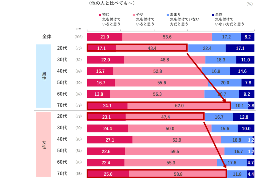 - 「特に気を付けていると思う」「やや気を付けていると思う」のTop 2 Box合計は全体で74.6%と、7割以上が感染予防行動に配慮。一方で、男女とも年代別で20代が最も低く、20代男性は60.5%(全体より▲14.1pts)、20代女性は70.5%(▲4.1pts)。