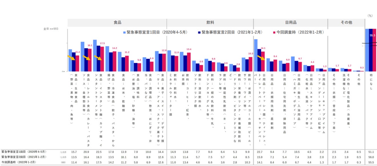3)購入が増えたものの比較(第6波と過去2回の緊急事態宣言の比較)