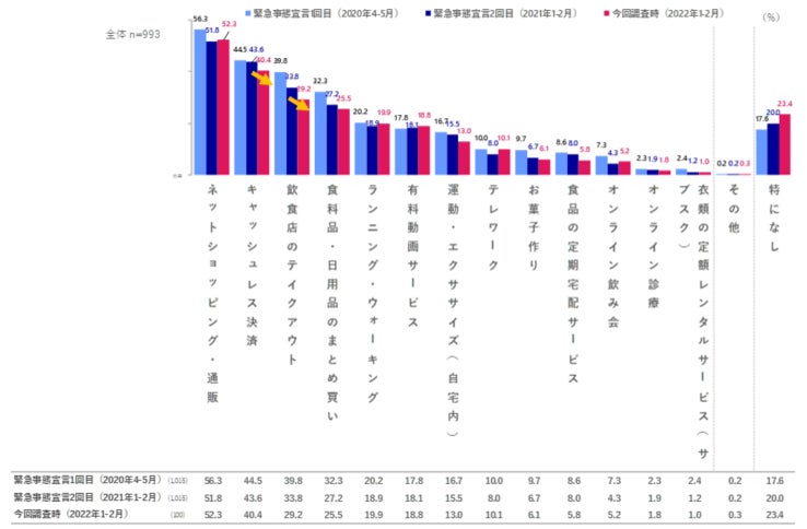 - 「第6波は、第2回の緊急事態宣言と比較して、「飲食店のテイクアウト」▲4.6pts(33.8%→29.2%)、「キャッシュレス決済」▲3.2pts (43.6%→40.4%)と減少。利用が増えたサービスも軒並み微増に留まる