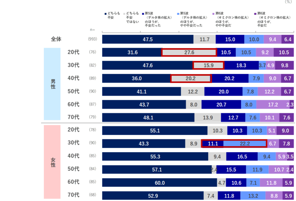 - 「どちらも不安」が全体で47.5%と半数であり、各性年代でも最も多い回答。第5波と第6波の比較では、 「第5波(デルタ株)の方が不安」が+9.2ptsと多い。 (「第5波(デルタ株)の方が不安」が「やや不安」も含めて25.0%、「第6波の方が不安」が15.8%)