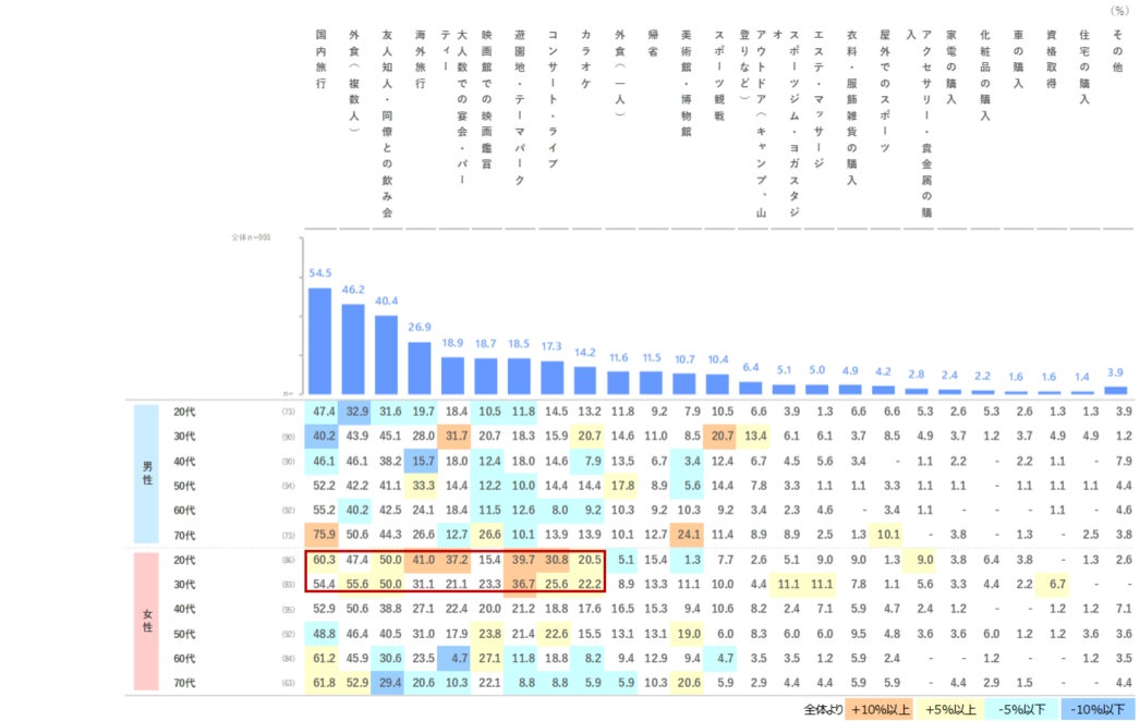 - 「国内旅行」が全体で54.5%と多数。特に20・30代女性のお出かけ志向が高い。