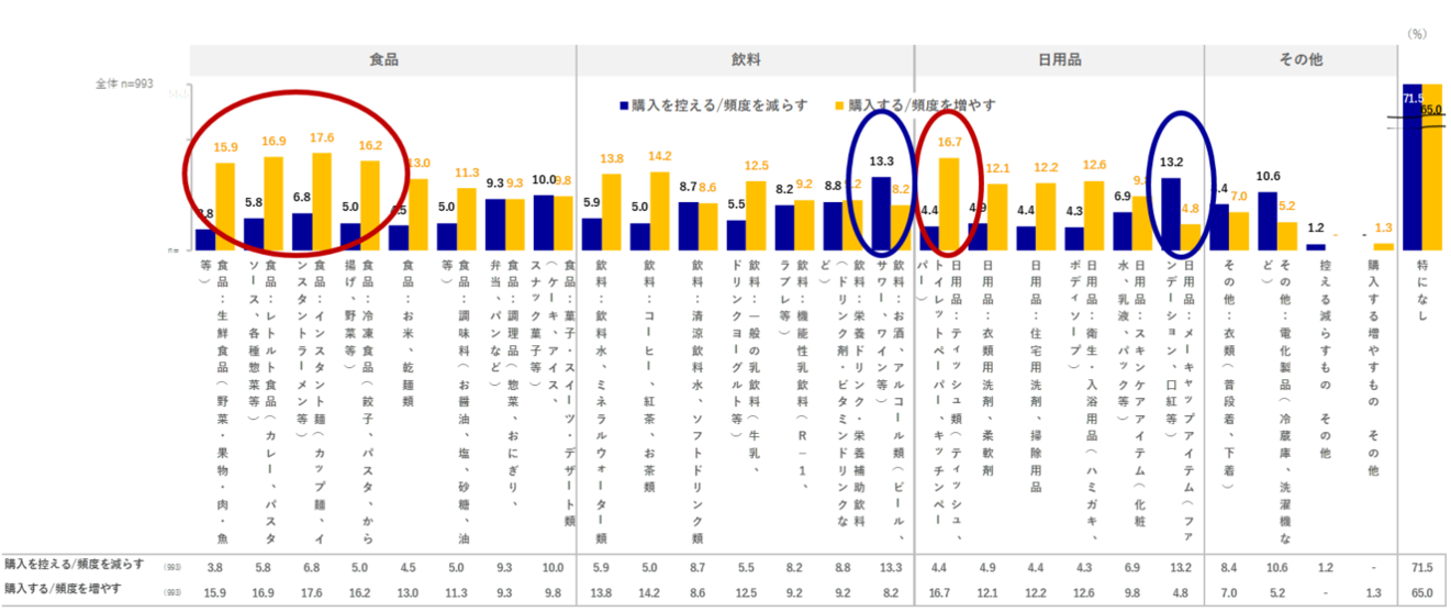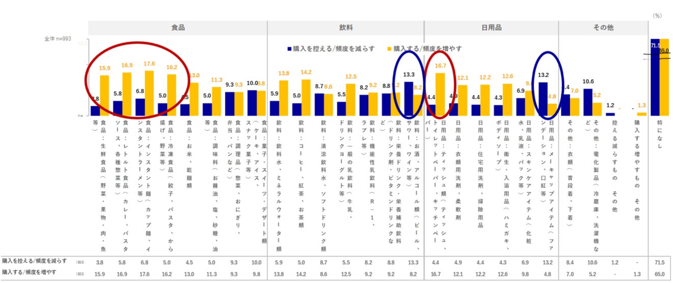 - 「特になし」が7割と多数を占めるが、食品・飲料・日用品とも「今後、購入頻度を増やそうと考えているもの」が「減らそうと考えているもの」より多く1-2割ほど存在。特にレトルト・インスタント食品などの保存食、ティッシュ類が2割。