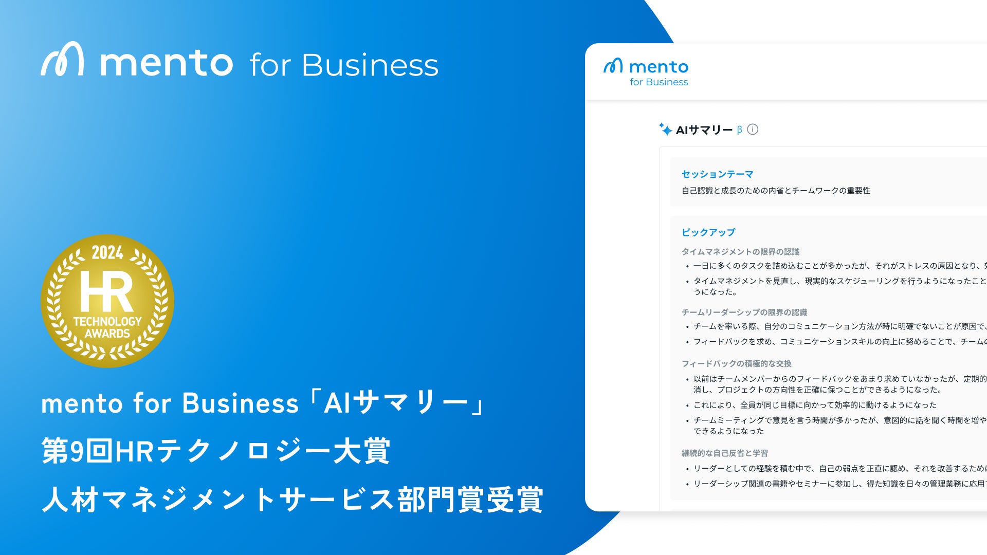 マネジメントコーチ「mento for Business」AIサマリー、第9回HRテクノロジー大賞で部門優秀賞を受賞
