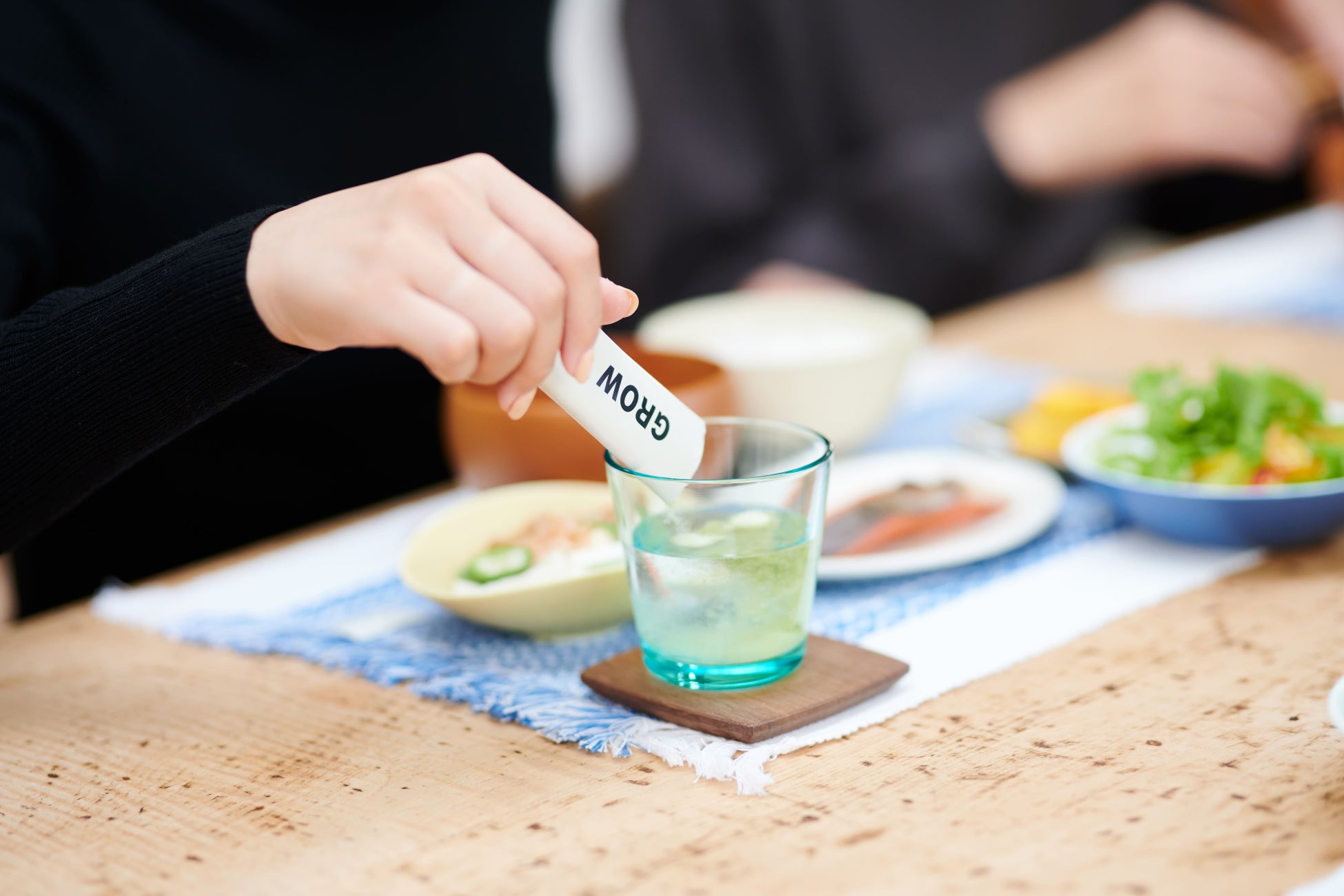 「aub GROW」は、腸内細菌のエサとなる水溶性食物繊維を種類豊富に補給できる、緑茶風味の粉末ドリンクタイプの商品です。