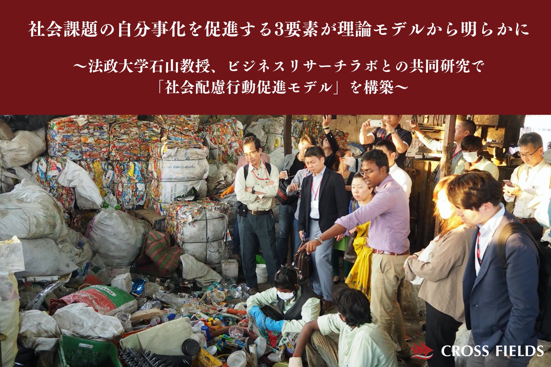 NPO法人クロスフィールズ(東京都品川区、代表:⼩沼⼤地)は、法政大学大学院 石山恒貴教授と株式会社ビジネスリサーチラボ(東京都目黒区、代表:伊達洋駆)と共同で「社会配慮行動促進 (=社会課題の自分事化を通じた行動発揮)」に関する理論モデルを開発、社会課題の自分事化が「俯瞰」「危機感」「内発性」の3つの要素で促進されることがわかりました。本モデルの構築によって「個人の社会課題に対する当事者意識がどれだけ育まれたか」について、アンケートを活用した分析を通じて測定・評価することが可能になりました。クロスフィールズでは、本理論モデルやアンケート回答結果を活用したプログラムの改善や社会インパクトの測定/発信に力を入れていく予定です。