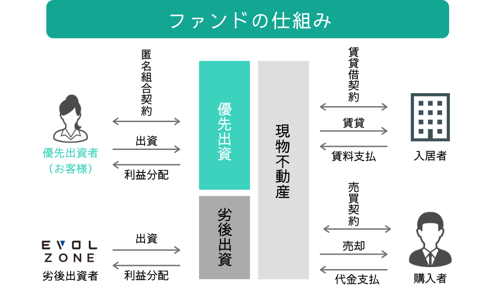 不動産事業においては、不動産評価の下落・空室の発生などの要因により損益が発生する場合もありますが、投資家様のリスクを考え優先劣後方式を採用。投資家様が優先出資者、当社が劣後出資者となり、利益が生じた場合は優先出資者から優先的に分配され、損益が発生した場合は劣後出資者からの負担となりますので資家様の元本の安全性を考慮した仕組みとなっております。