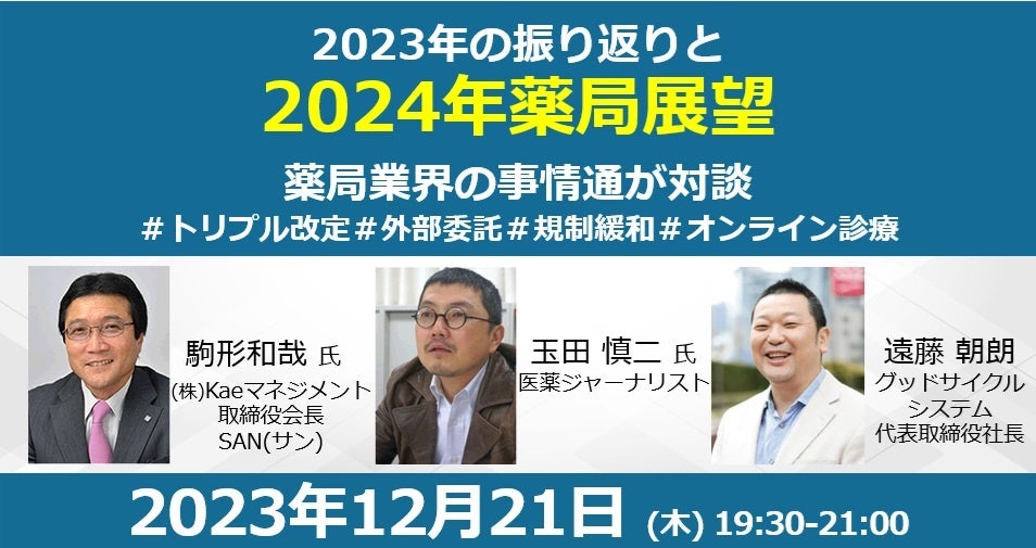 株式会社グッドサイクルシステム(本社:東京都渋谷区、代表取締役社長:遠藤 朝朗)は、薬局経営者・薬剤師向けにオンラインセミナーを無料で開催します。今回は、Kaeマネジメント 駒形和哉氏と医薬ジャーナリスト 玉田慎仁氏をお招きし、「2023年の振り返りと2024年の薬局展望」について、グッドサイクルシステム代表取締役社長 遠藤朝朗との対談形式でお話いただきます。