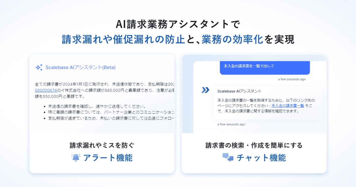 アルプ株式会社(代表取締役CEO:伊藤 浩樹、以下「当社」)は、当社が運営する請求書発行システム「Scalebase ペイメント」において、生成AI技術を活用した2つの新機能「AI請求業務アシスタント(β版)」および「AI書類読み取り(β版)」をリリースしたことをお知らせいたします。