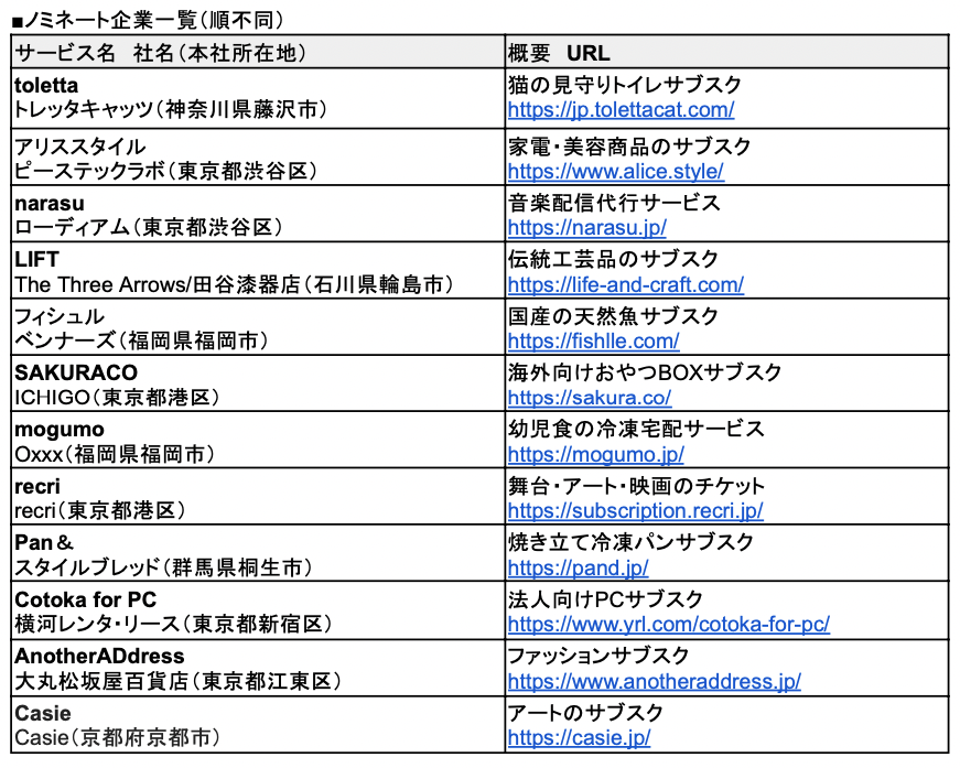 2023年はエントリー企業約150社の中から、ノミネート企業12社が決まりました。フードロスやSDGsといった定番となりつつあるサブスクだけでなく、ペットやアート、ファッションといったジャンルから多岐にわたるサービスがノミネートされました。