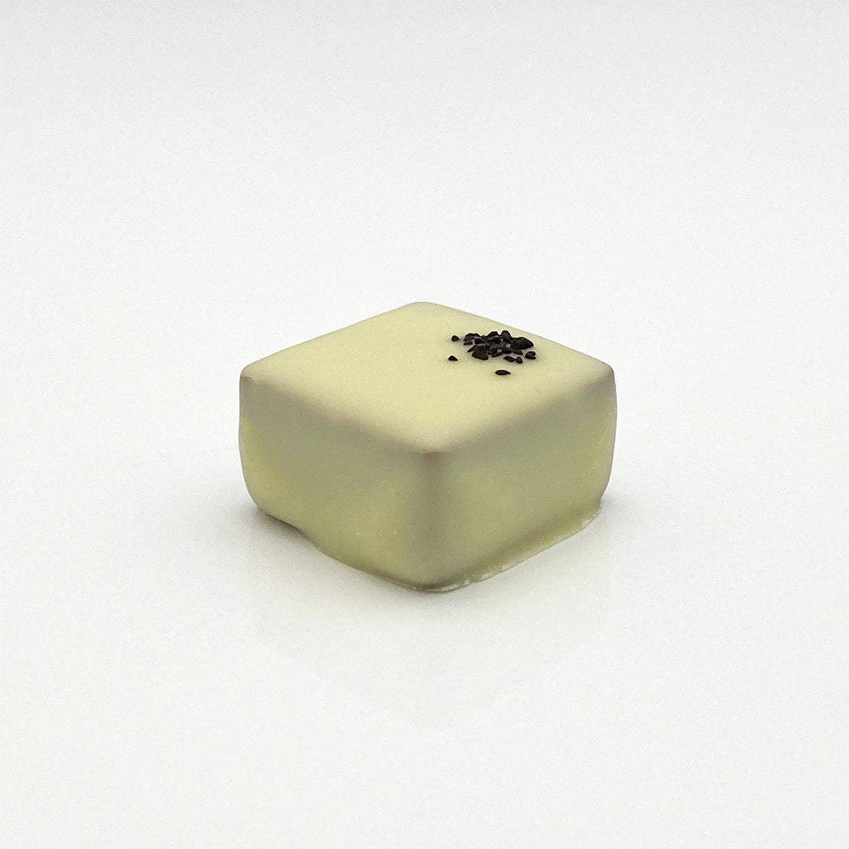 バニラの香りのアーモンドペーストにレモンを混ぜ込んだフィリングをホワイトチョコレートで包み、バニラビーンズをトッピング。