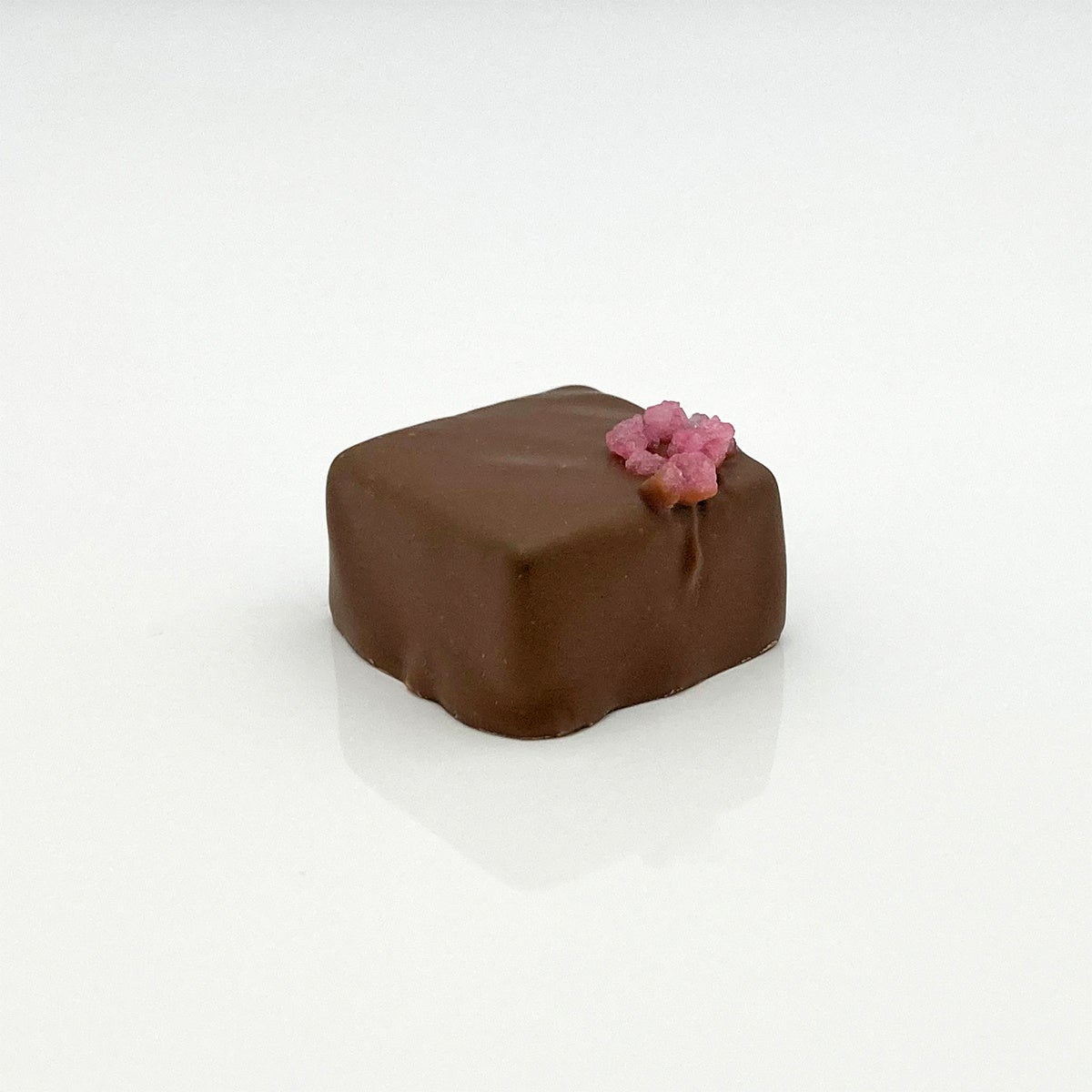 香り高いローズとラズベリーティのフィリングをダークチョコレートのシェルで包み、砂糖漬けのバラの花びらをトッピング。
