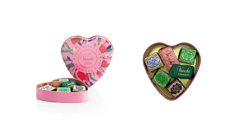 ライラックピンクの小さなハート型の缶に、イタリア伝統のチョコレート「ジャンドゥイオット」2種と「クレミノ」3種をアソート。