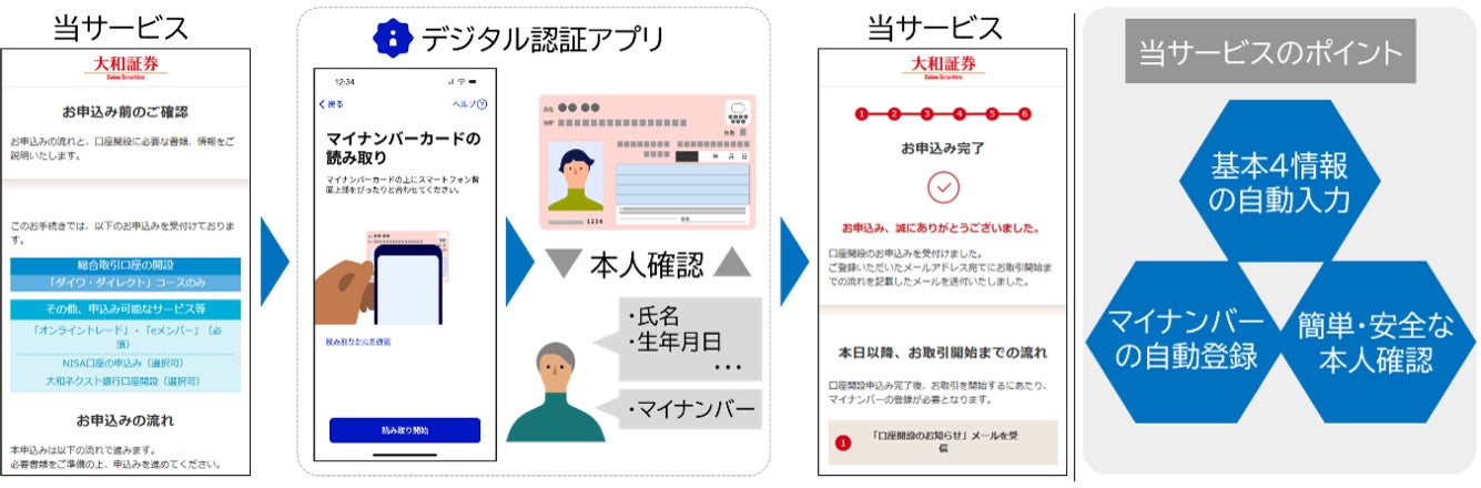 大和証券株式会社は、株式会社大和総研、株式会社ワークシーと協働し、新たな非対面口座開設サービス(以下、当サービス)を6月23日(月)にリリースいたします。当サービスでは、デジタル庁が提供する「デジタル認証アプリ」を利用し、マイナンバーカードを使った本人確認とマイナンバーの自動届出による口座開設が可能になります。この「デジタル認証アプリ」を利用した本人確認とマイナンバーの自動届出による口座開設は民間金融機関で初めてとなります。