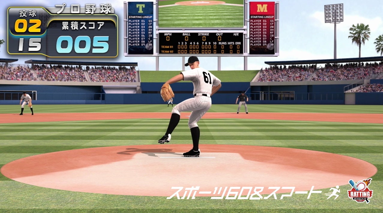 - 投球開始はペダルを踏む事で始まり、正面スクリーンに映し出される投手のピッチングに合わせ、約10秒ごとにボールが立て続けに発射されます。