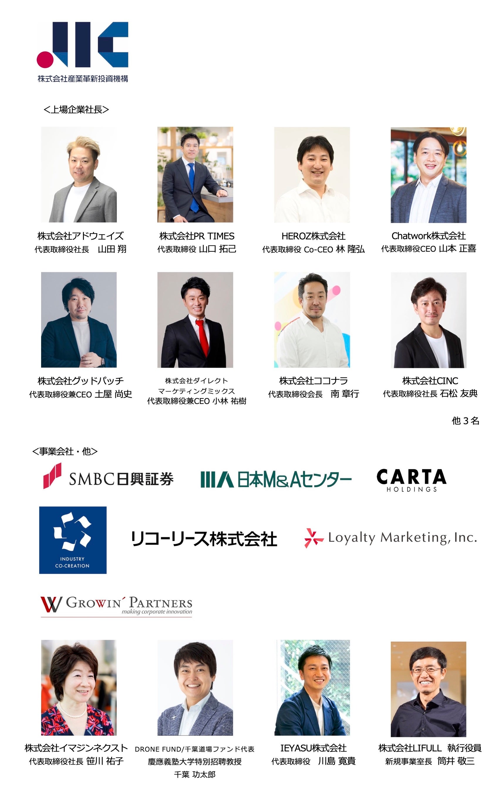 本ファンドは機関投資家の産業革新投資機構と上場企業創業者11名、事業会社、個人投資家がLP出資する国内VCファンドで、最終的なファンド総額は100億円規模を予定しています。これにより、ファンド規模を高めつつ、上場起業家が後輩起業家の経営推進をアシストする体制を新設し、ビジネスと信頼の輪を拡大してゆきます。