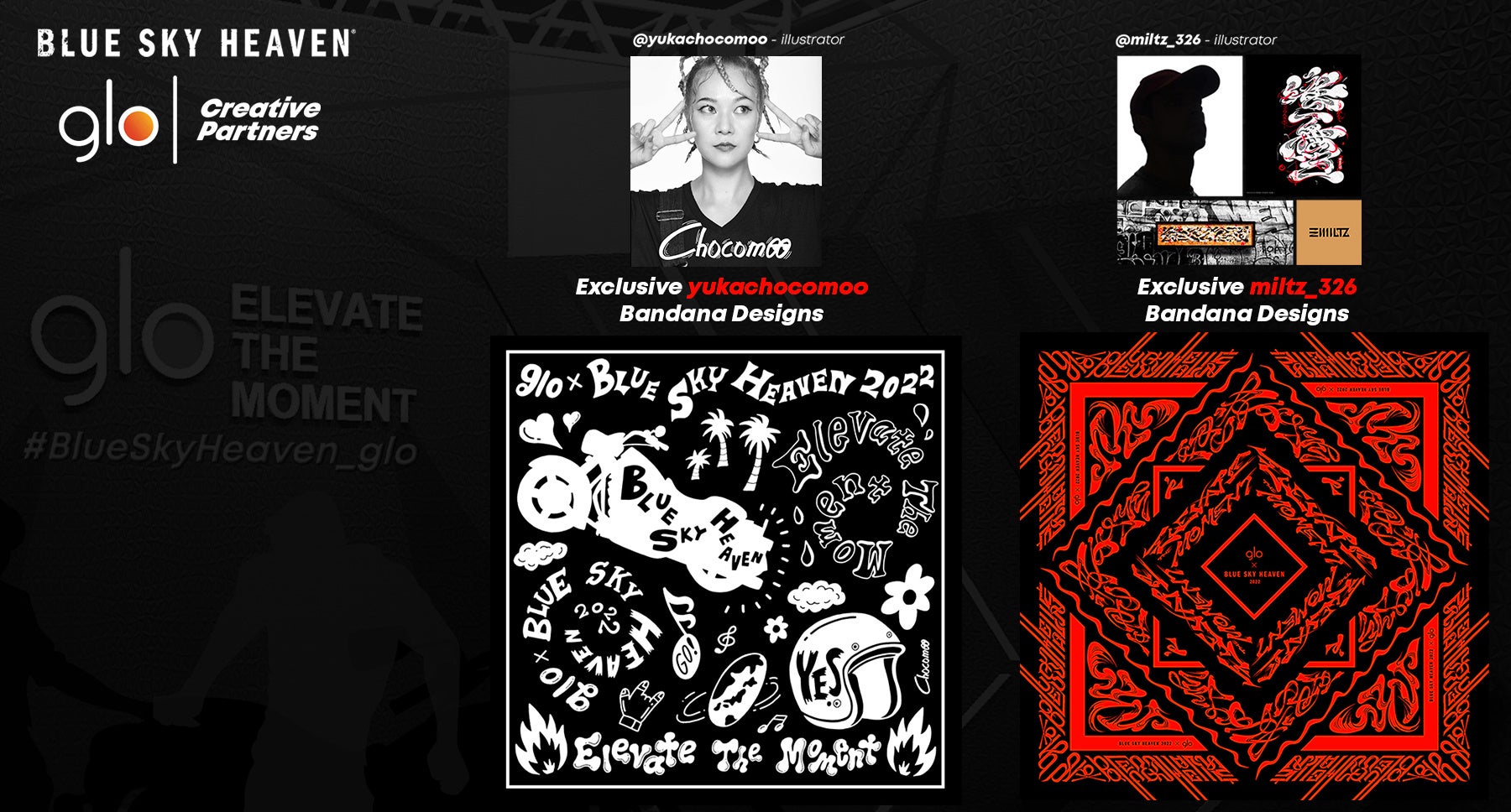 glo(TM)の世界観を体感いただけるBLUE SKY HEAVEN限定のフォトスポットです。フォトブースに設置されたハーレーダビッドソンのバイク実機と一緒に記念写真をご撮影いただけます。また、限定フォトスポットで写真撮影いただいた先着500名様には、世界で活躍するアーティストらがデザインしたイベント限定のオリジナルバンダナをプレゼントいたします。