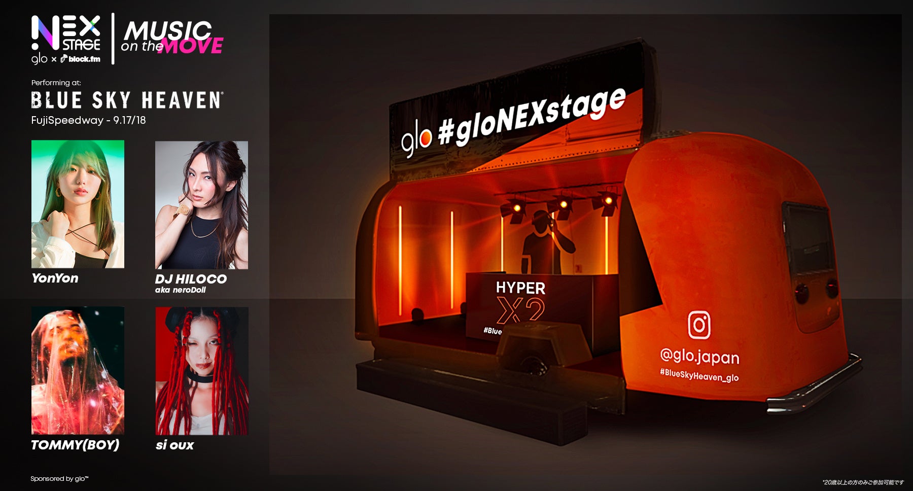 新世代の音楽マルチメディア「block.fm」とglo(TM)がコラボしたプロジェクト「glo(TM) NEX STAGE」がプロデュースしたDJブースをメインのglo(TM)ブーストステーション横に設置し、豪華アーティストらが会場内を盛り上げます。